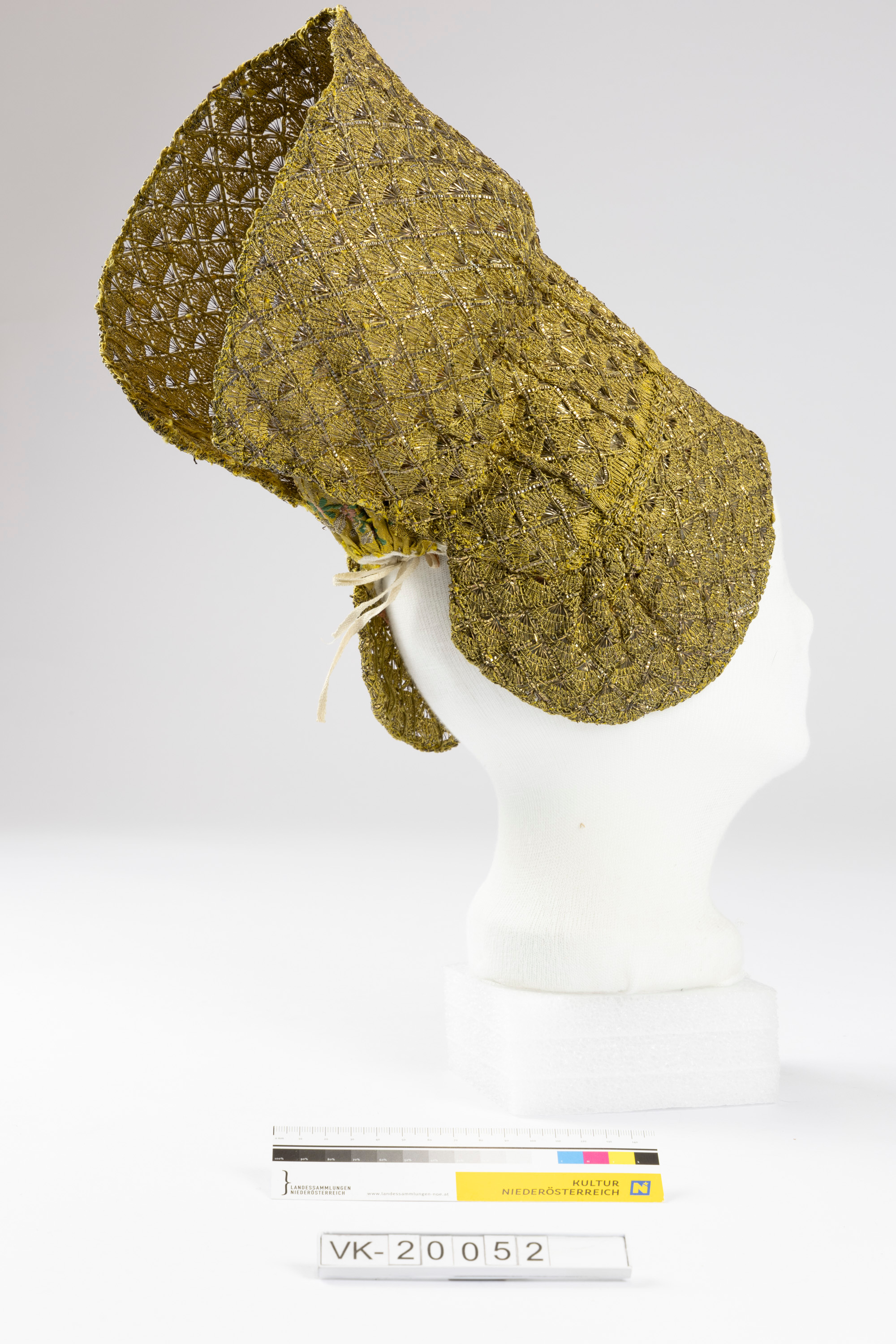 Goldhaube (Drahtlhaube, Flügelhaube, möglicherweise Retzer Haube) mit Überhaube aus Goldspitze mit Drahtverstärkung, Unterhaube aus Golddrahtgewebe mit Golddrahtbestickung (mit Pailletten und Glasperlen) und einem breiten Goldspitzenschirm mit Drahtverstärkung. Die Haube hat ein weißes Leinenfutter und weiße Köperbändchen.