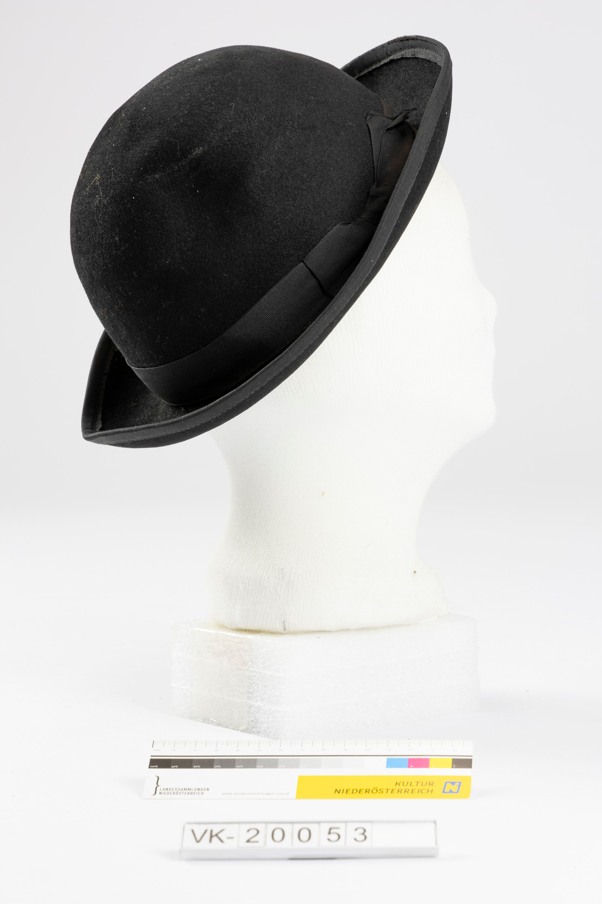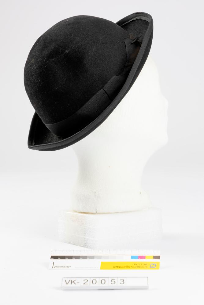 Schwarzer Filzhut ("Reindlhut"), rund mit aufgebogener Krempe und einem Hutband aus Rips. Der Hut hat innen einen Aufdruck.