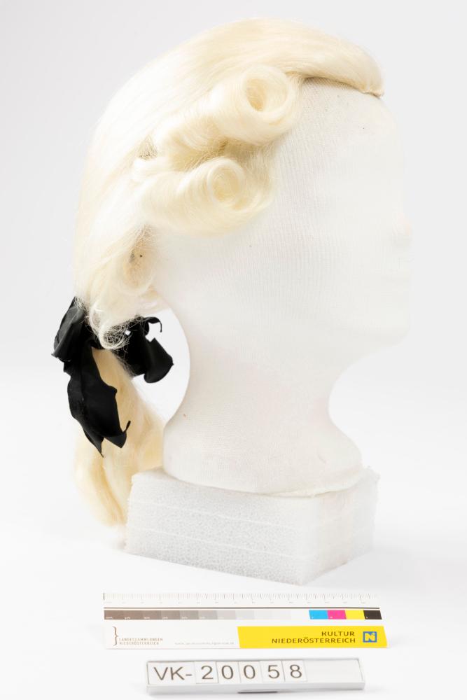 Weiße Kunsthaarperücke auf weißem Netzstoff, mit Gummi- und Köperband, im Stil des 18. Jhdts., mit Seitenlocken und Schwanz (mit schwarzer Taftmasche), laut Karteikarte "Mozartfasson".