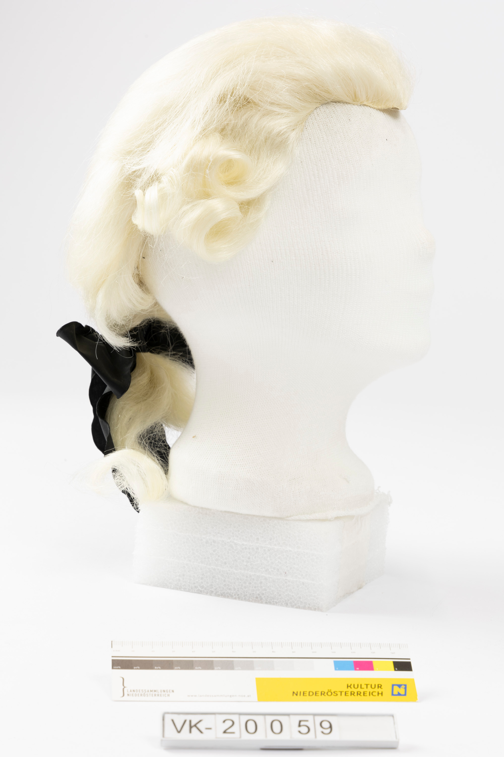 Weiße Kunsthaarperücke auf weißem Netzstoff, mit Gummi- und Köperband, im Stil des 18. Jhdts., mit Seitenlocken und Schwanz (mit schwarzer Taftmasche), laut Karteikarte "Mozartfasson".