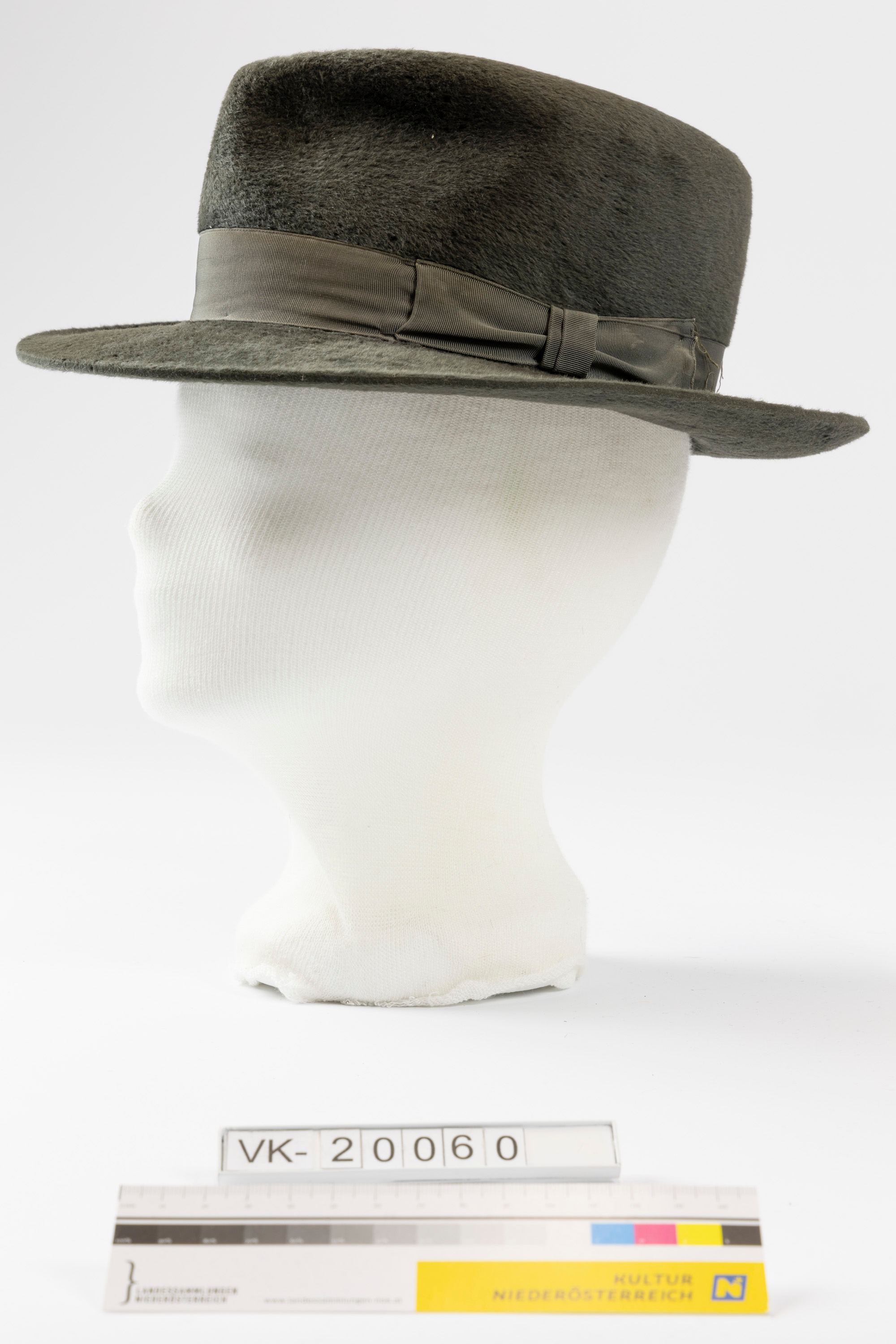 Runder Filzhut mit eingedrücktem Boden und einer braunen Ripsbandschleife, mit Lederschweißband und einem Aufdruck im Hut: "Anton TRINKL .... WOLKERSDORF".