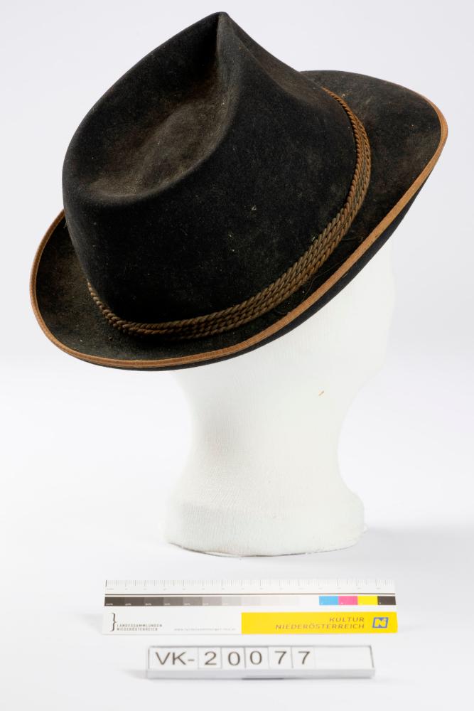 Schwarzer Herrenfilzhut mit leicht konischem Kopf, oben und seitlich eingedrückt, mit hinten aufgebogener Krempe, mit braunem Ripsband gefasst. Der Hut hat ein Band aus brauner mehrfach gelegter Kordel. Innen hat der Hut ein Schweißband aus schwarzem Leder mit Aufdruck: "JOH. GÄRNER WIEN" und einer Prägung: "ANTON PICHLER GRAZ", "W. G".