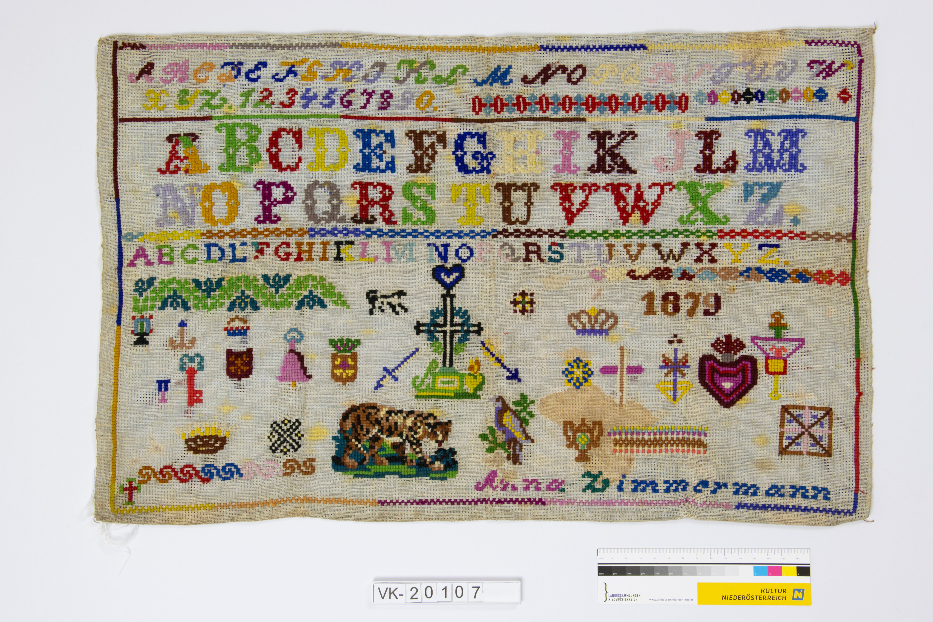 Weißes Aidastofftuch, mehrfärbig im Kreuzstich bestickt mit Zierborten, Alphabeten und Ziffern, religiösen Motiven, Tieren, dazu "1879", "Anna Zimmermann". Es handelt sich um eine Volksschularbeit.