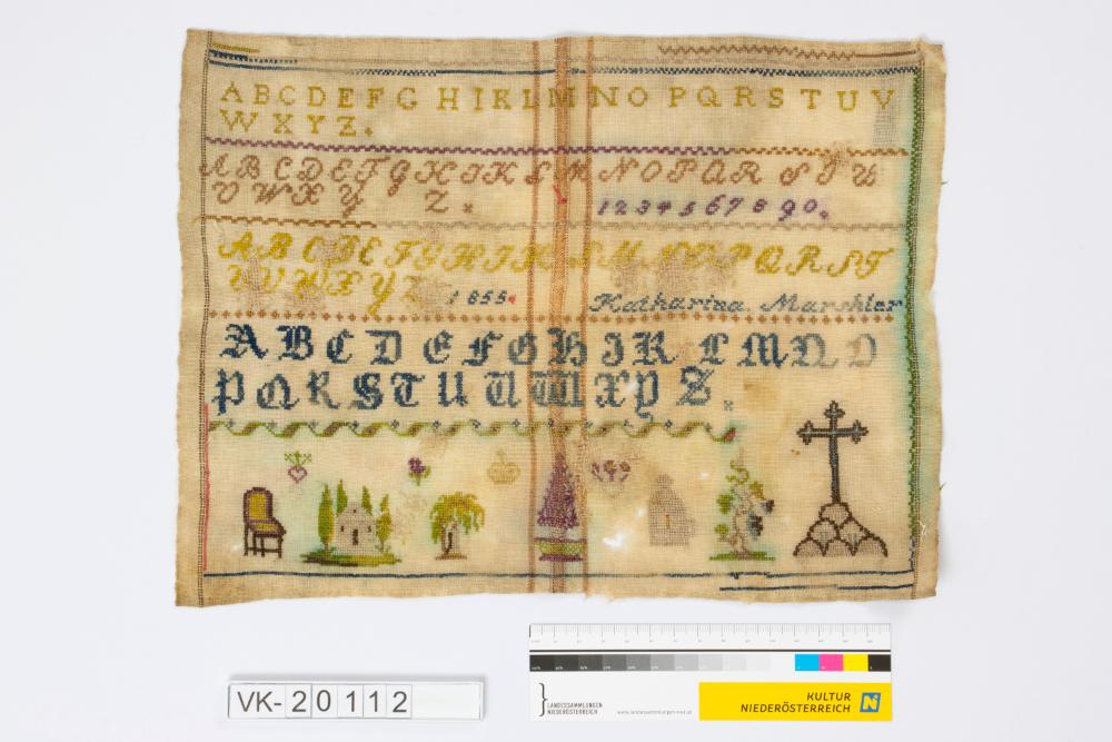 Beiges Aidastofftuch mit mehrfärbiger Bestickung im Kreuzstich: Alphabete, religiöse Motive, Landschaftsmotive, Gegenstände. Dazu "Katharina Ma...ler 1855".
