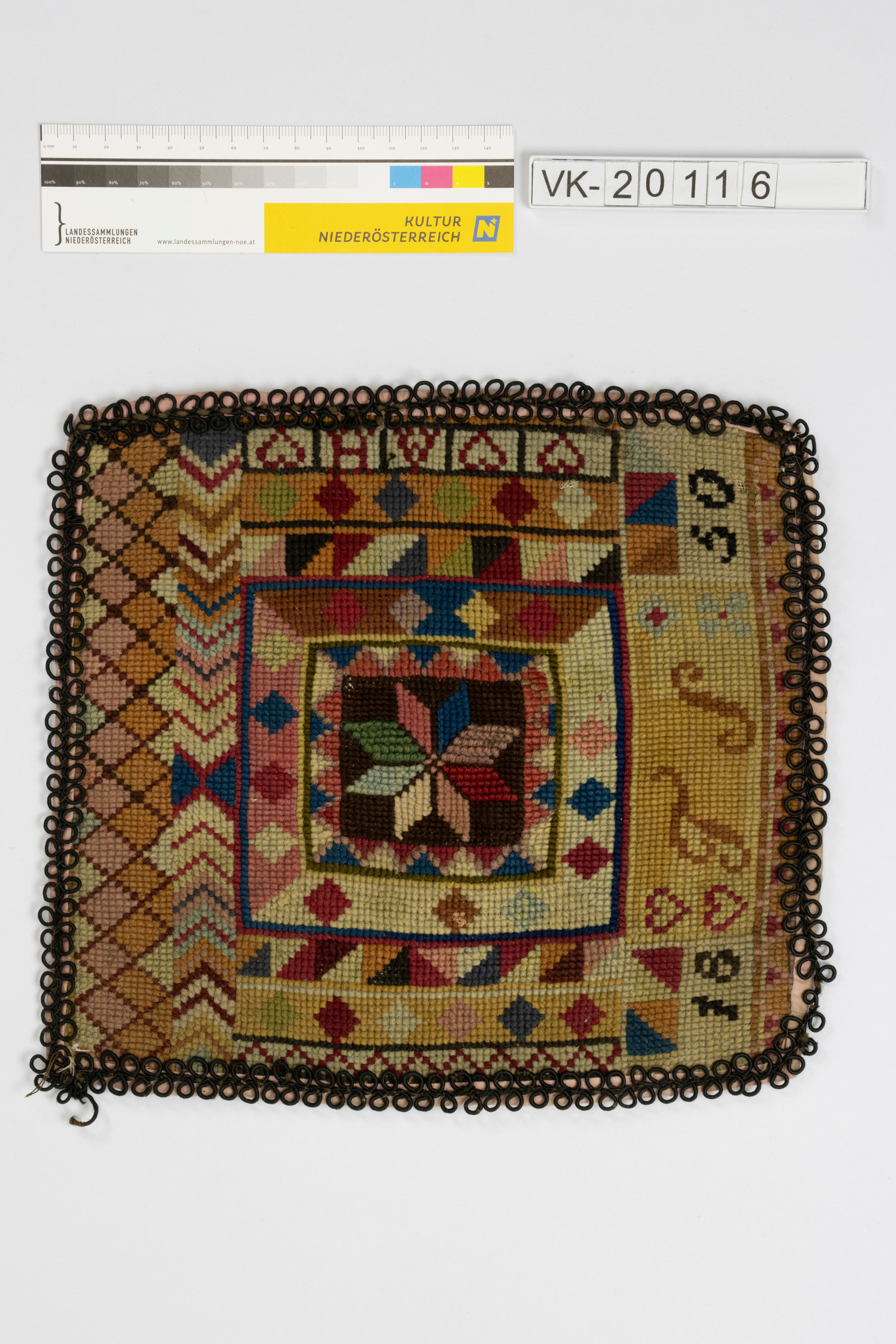 Annähernd quadratisches Tuch, vollflächig, mehrfärbig mit geometrischen Mustern, in der Mitte einem Sternmotiv, dazu Herzchen und "18 TS 50". Das Tuch ist rosa gefasst, an der Rückseite mit braunem Leinen besetzt, und hat umlaufend eine schwarzbraune Posamentrieschleifenborte.