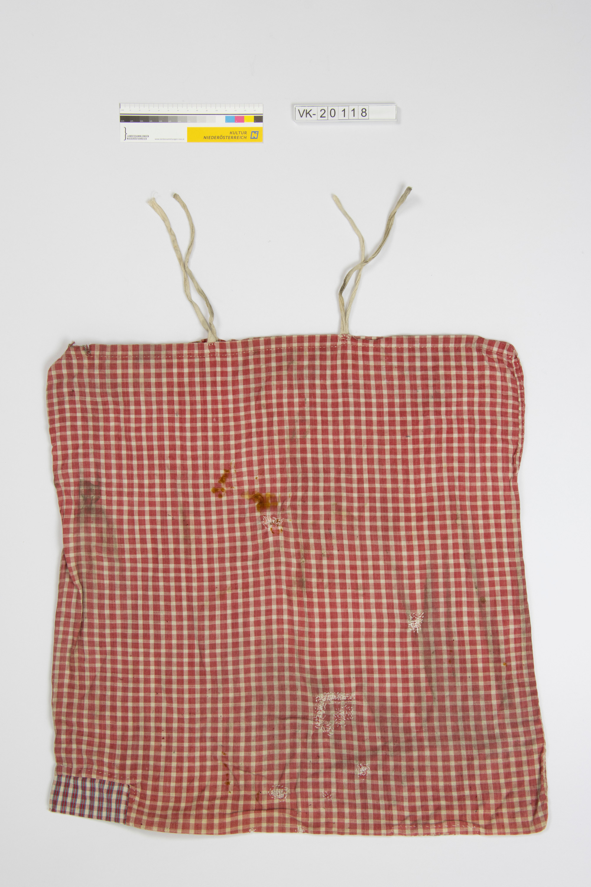 Rot und weiß karierter Polsterüberzug, mit weißen Köperbändchen zum Binden; mit ähnlichem Stoff ausgebessert.