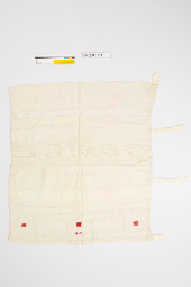 Mustertuch aus weißem Feinleinen: Das Tuch hat eine eingesetzte Spitzenborte, Biesen, eine Knopfleiste mit Zwirnknöpfen, eingesetzte Flicken und eine rote Bestickung im Kreuzstich: "RP".