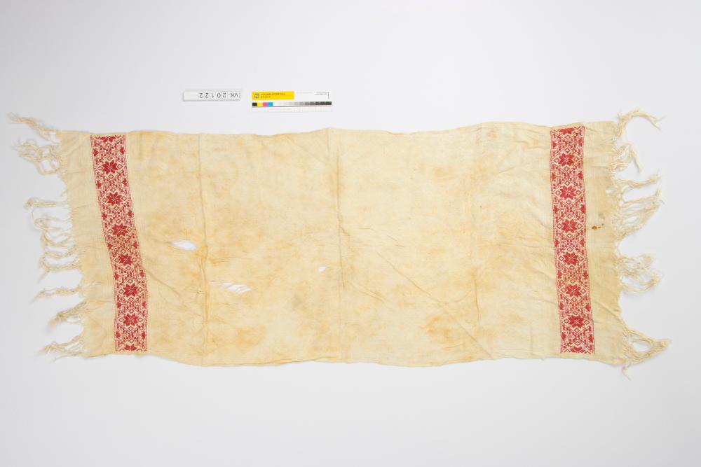 Weißes Damasthandtuch mit geknüpften Fransen an den Schmalseiten, mit zwei roten Zierborten bestickt.