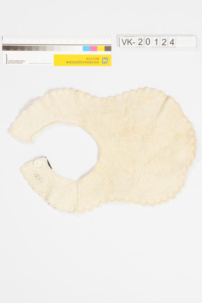 Weißes floral gemustertes Damastlätzchen, mit umstochener Bogenkante und einem weißen Bakelitknopf.