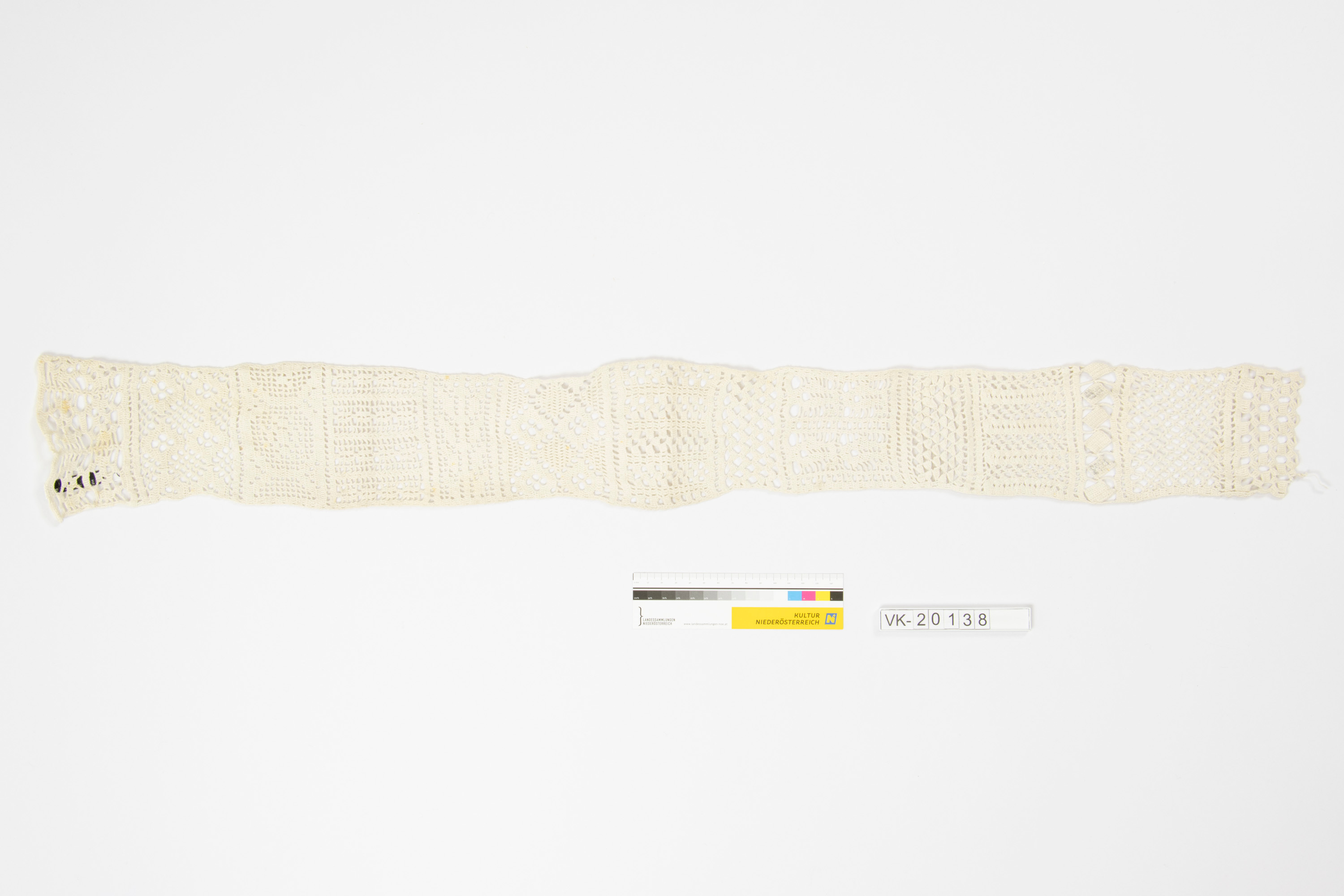Weißes Häkelmusterband mit durchbrochenen Häkelmustern.