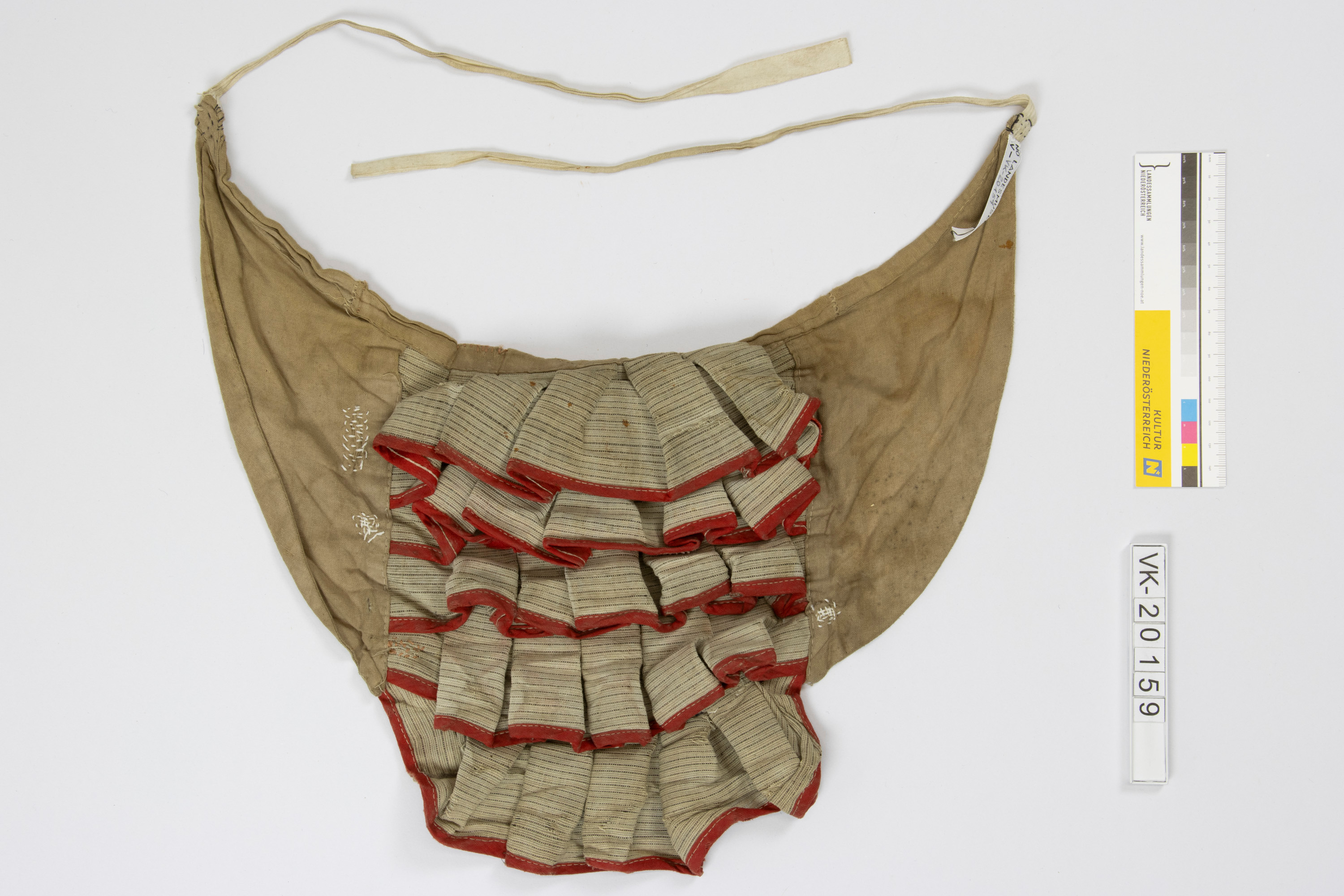 Cul de Paris mit braunen Seitenteilen aus Leinen, in weiße Köperbänder mündend, und voluminösem gestreiftem fünffachem Stoffrüschenbesatz mit rot gefasster Unterkante.