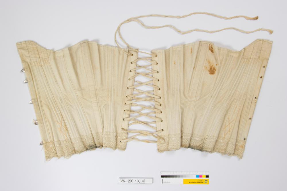 Weißes verstärktes Leinenkorsett mit Schnürung und Metallhakenverschluss, mit Spitzenbesatz und beigen Verzierungen, an der Ösenleiste bedruckt: "Pat. No. 7486".
