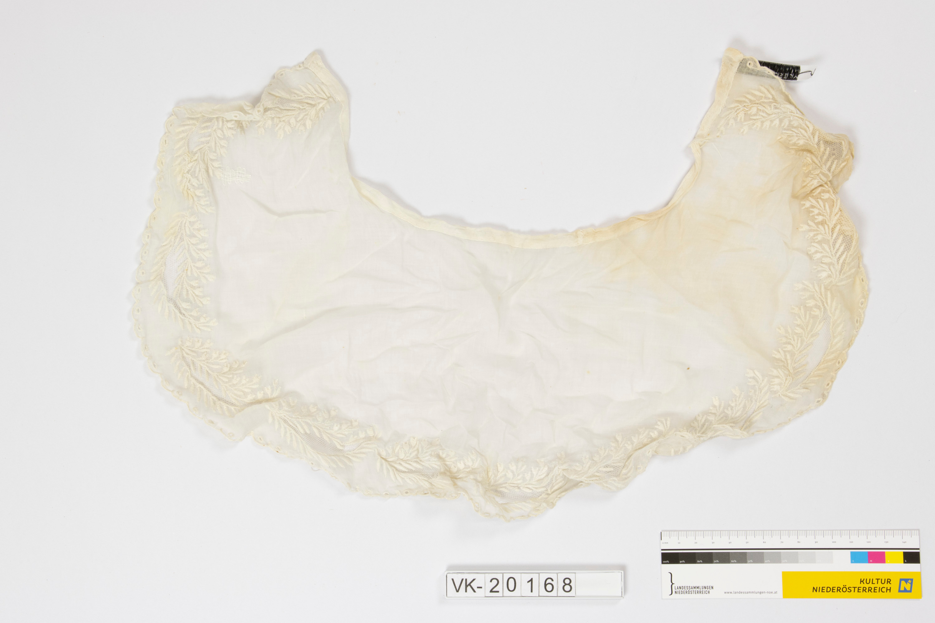 Weißer Kragen mit umlaufendem Weißstickereidekor (Blättchenmuster, Bogenkante mit kleinen Löchern, Tülleinsätze).