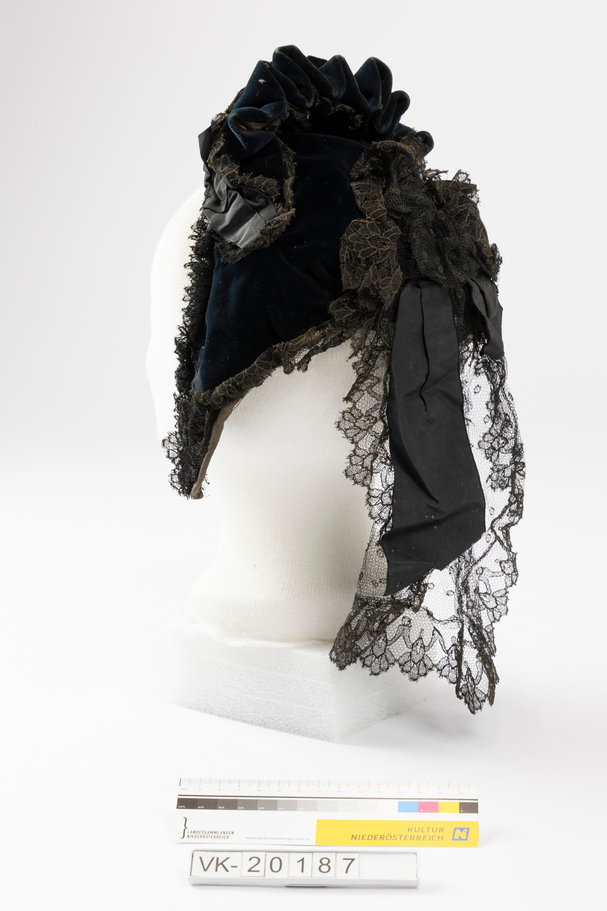 Blauschwarze Samthaube mit Drahtverstärkung, mit Tüllspitzenrüschen und Spitzenbesatz verziert, am Kopf mit Samtfaltenrüschen und schwarzen Taftbändern verziert. Futter dunkelbraun.