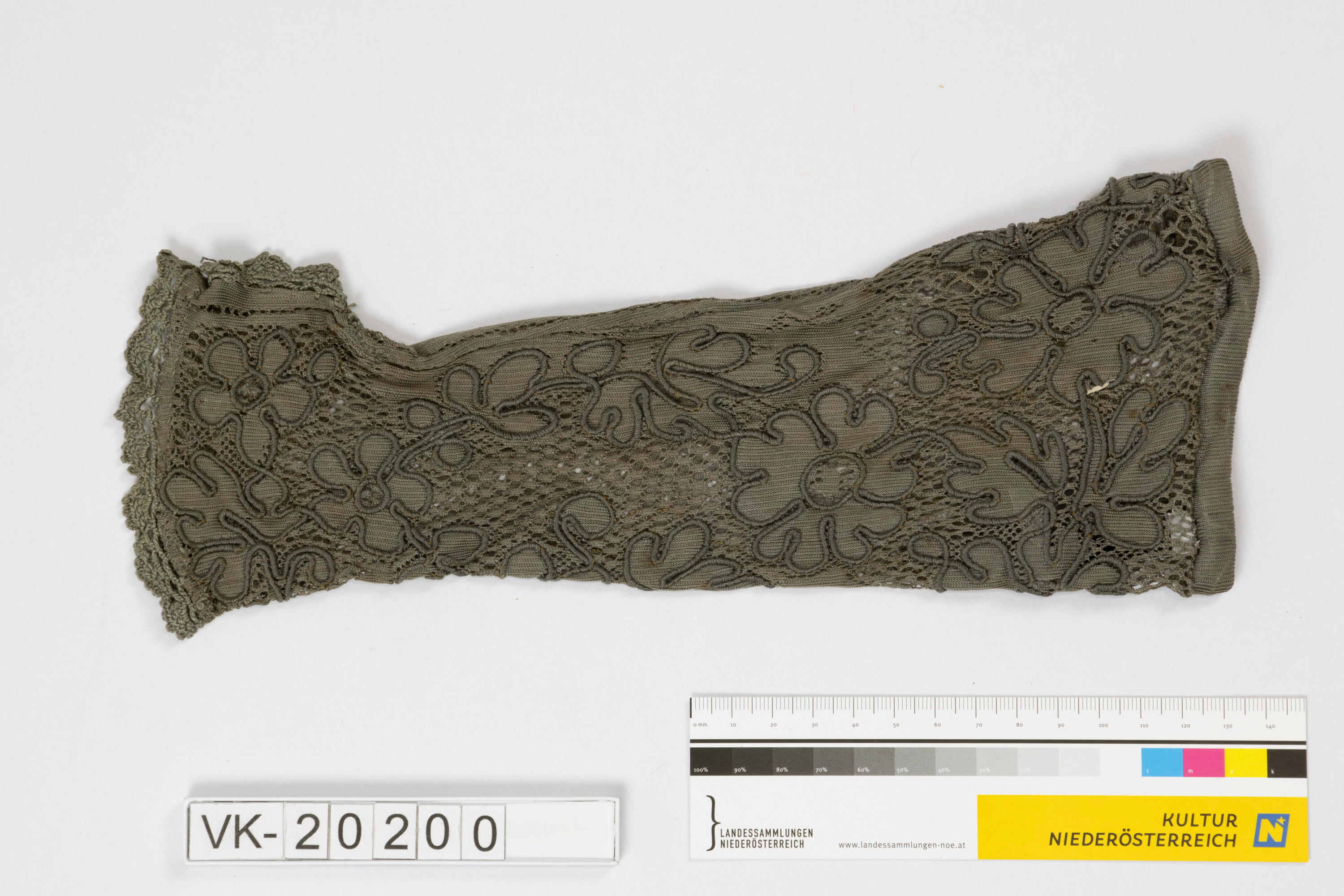 Grauer langer Damenhalbhandschuh, floral gemustert, laut Beitext Valensienne-Spitze.
