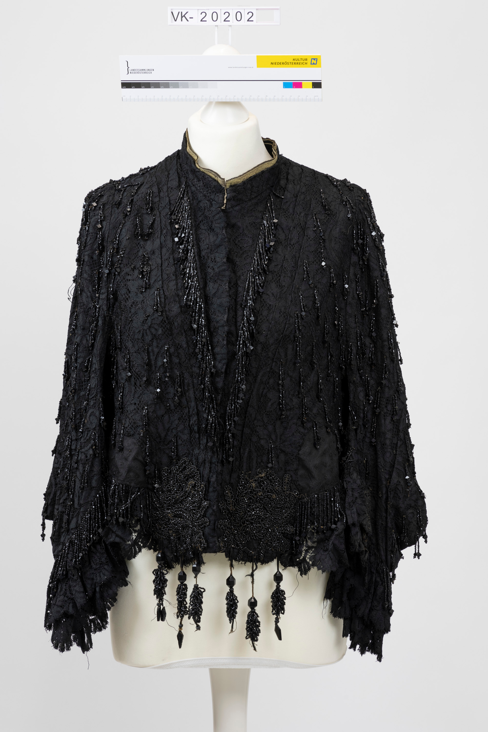 Schwarze, großflächig mit schwarzer Glasperlen- und Glasstiftelstickerei verzierte Bluse, mit weiten Ärmeln, kragenlos. Die Bluse ist mit schwarzem Spitzenbesatz verziert und hat ein Etikett: "Robes et Confections S. UNGAR. WIEN I. Rothenthurmstr. 4".