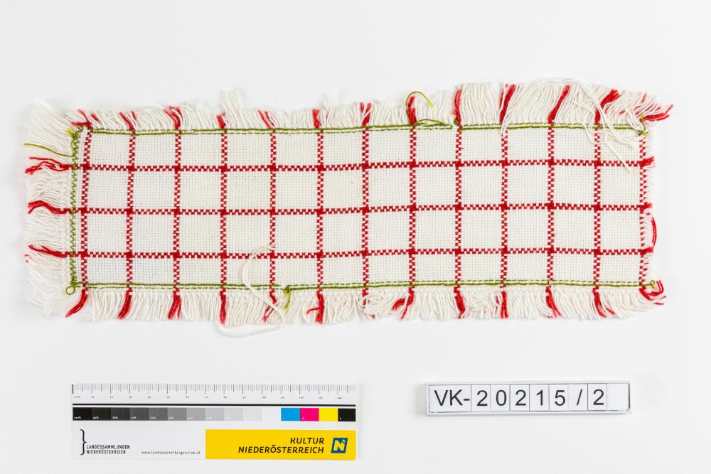 Längliches weißes Deckchen mit eingewebten, karierten, roten Musterstreifen und Fransen in weiß und rot an drei Kanten, an drei Kanten am Rand mit grünem Garn mit einer Kreuzstichborte bestickt. Das Objekt befand sich in der Schachtel, die mit XT 1 bezeichnet wurde.