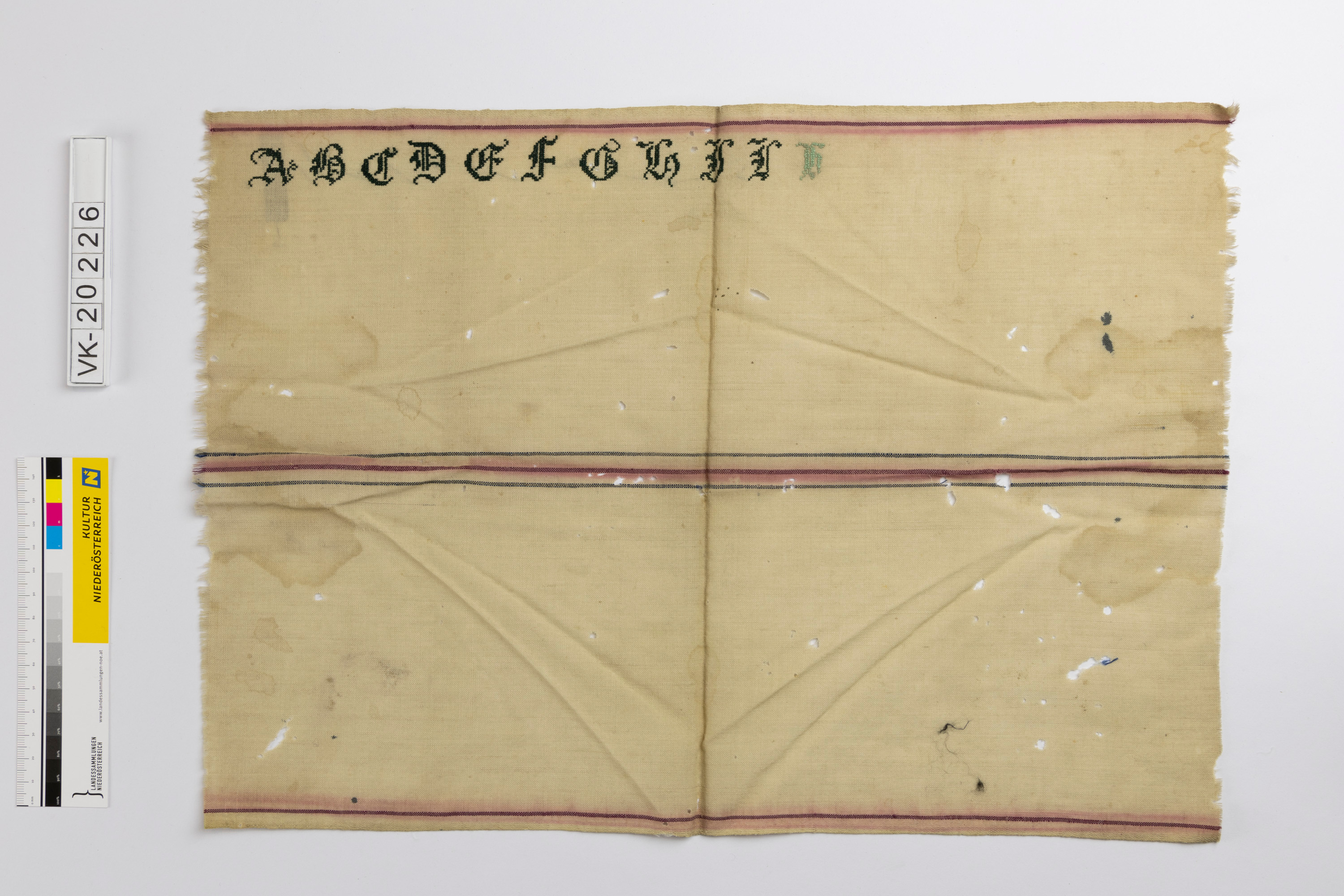 Begonnenens beiges Stickmustertuch mit roten Streifen, schwarz im Kreuzstich bestickt: Begonnenes Alphabet.