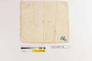 Annähernd quadratisches, weißes Leinendeckchen, umlaufend mit einer weißen Häkelspitze besetzt, bestickt in rot mit einem Dackel. Das Objekt befand sich in der Schachtel, die mit XT 1 bezeichnet wurde.