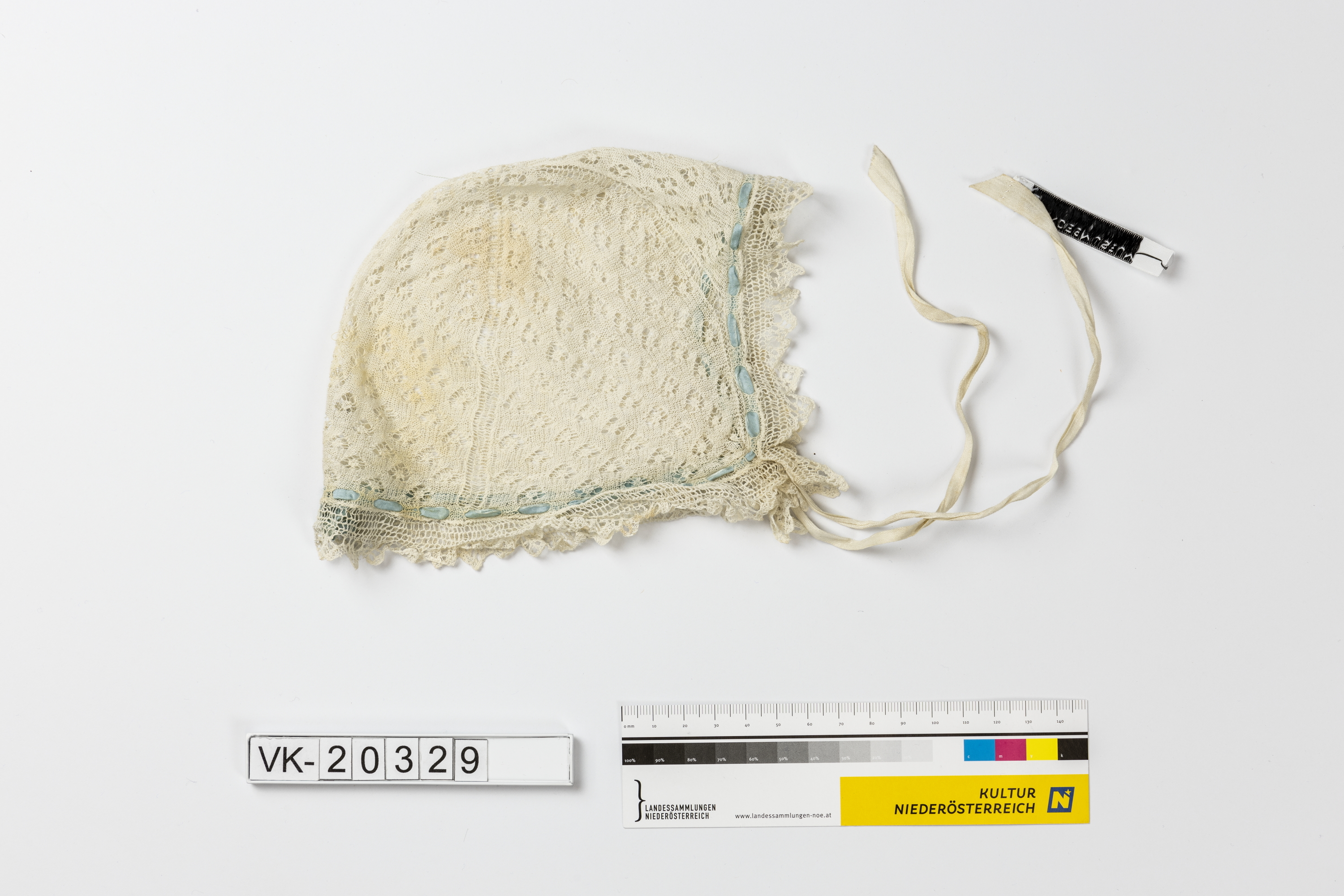 Weißes Spitzenbabyhäubchen mit durchbrochen gemustertem Kopf, umlaufendem Spitzenbesatz und einem blauen durchgezogenen Taftbändchen, dazu weiße Bindebändchen. Das Objekt befand sich in der Schachtel, die mit XT 1 bezeichnet wurde.