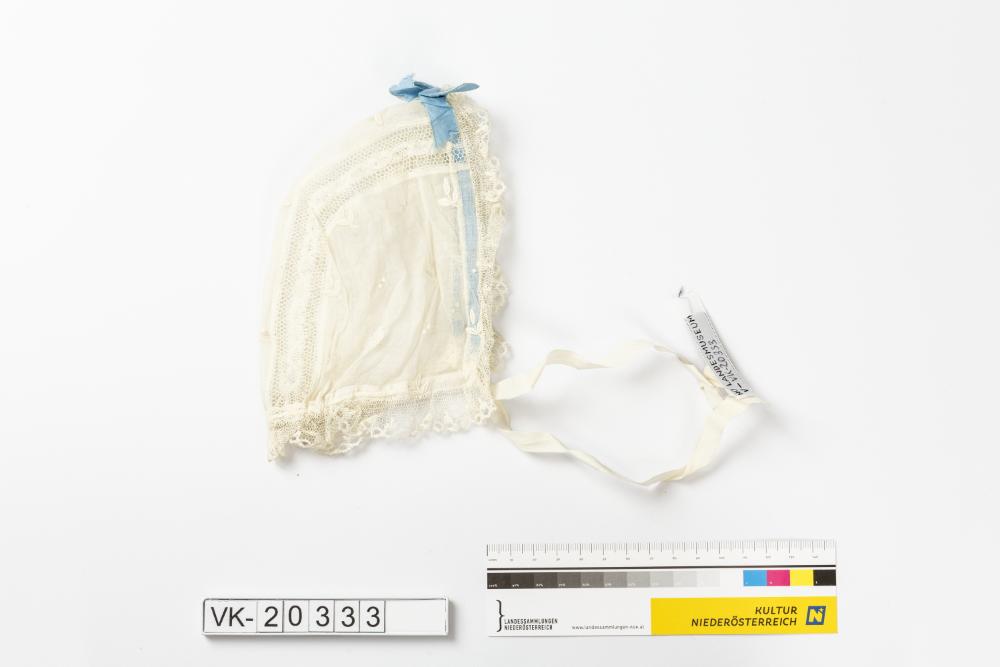 Weißes Babyhäubchen mit Spitzeneinsätzen und Spitzenbesatz, mit kleinen floralen Elementen weiß bestickt, mit einer blauen Taftschleife und weißen Bindebändchen. Das Objekt befand sich in der Schachtel, die mit XT 1 bezeichnet wurde.