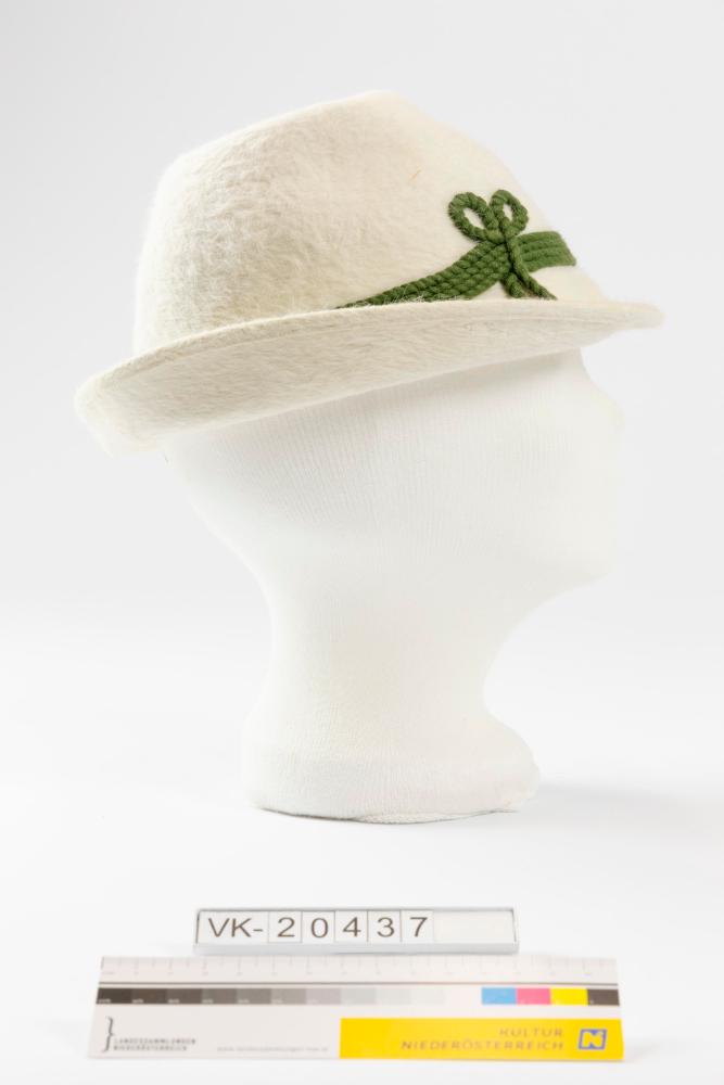 Weißer konischer Damenfilzhut mit aufgebogener Krempe und mehrfach gelegter grüner Kordel als Hutband. Der Hut hat ein weißes Ripsschweißband und ein Etikett: ""ORIGINAL Ischler HUT".