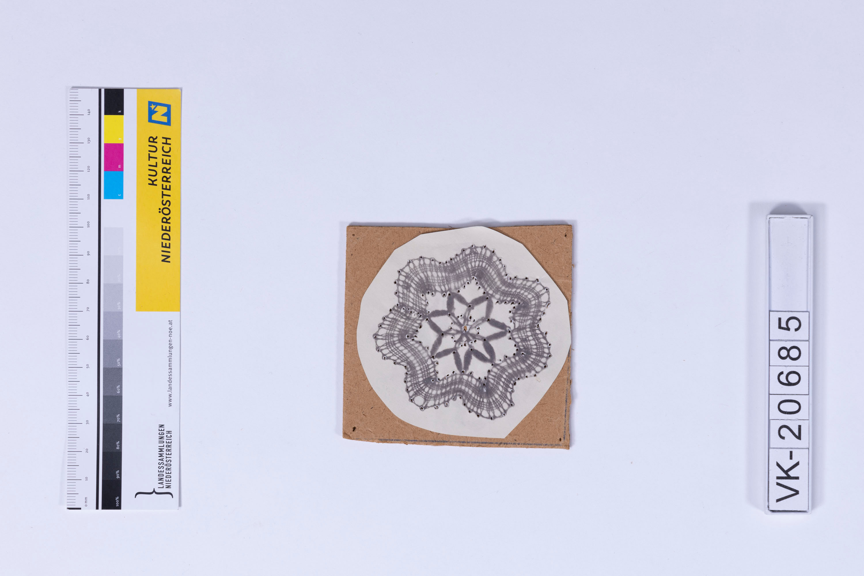 Klöppelbrief mit der Abbildung eines runden Deckchens (belichtet auf Fotopapier, wie VK-20687) auf einer Kartonplatte, gelocht. Fr. Bracher veranstaltete in den 1970er- und 1980er-Jahren Klöppelkurse über den ÖFB.