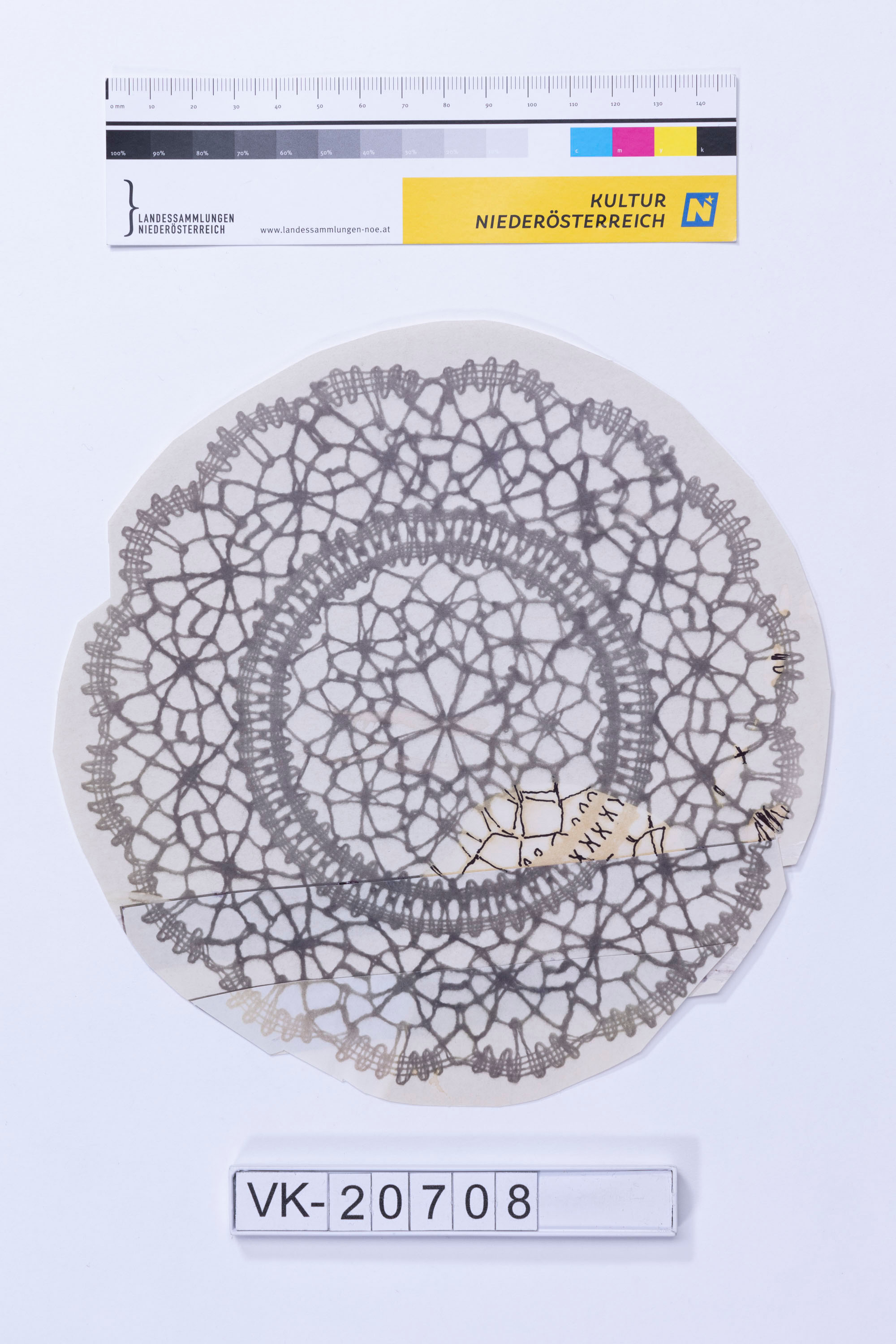 Abbildung eines runden Spitzendeckchens (belichtetes Fotopapier), aus drei Teilen gestückelt, fehlende (schlecht belichtete) Bereiche von Hand ergänzt, als Vorlagen für einen Klöppelbrief. Fr. Bracher veranstaltete in den 1970er- und 1980er-Jahren Klöppelkurse über den ÖFB.