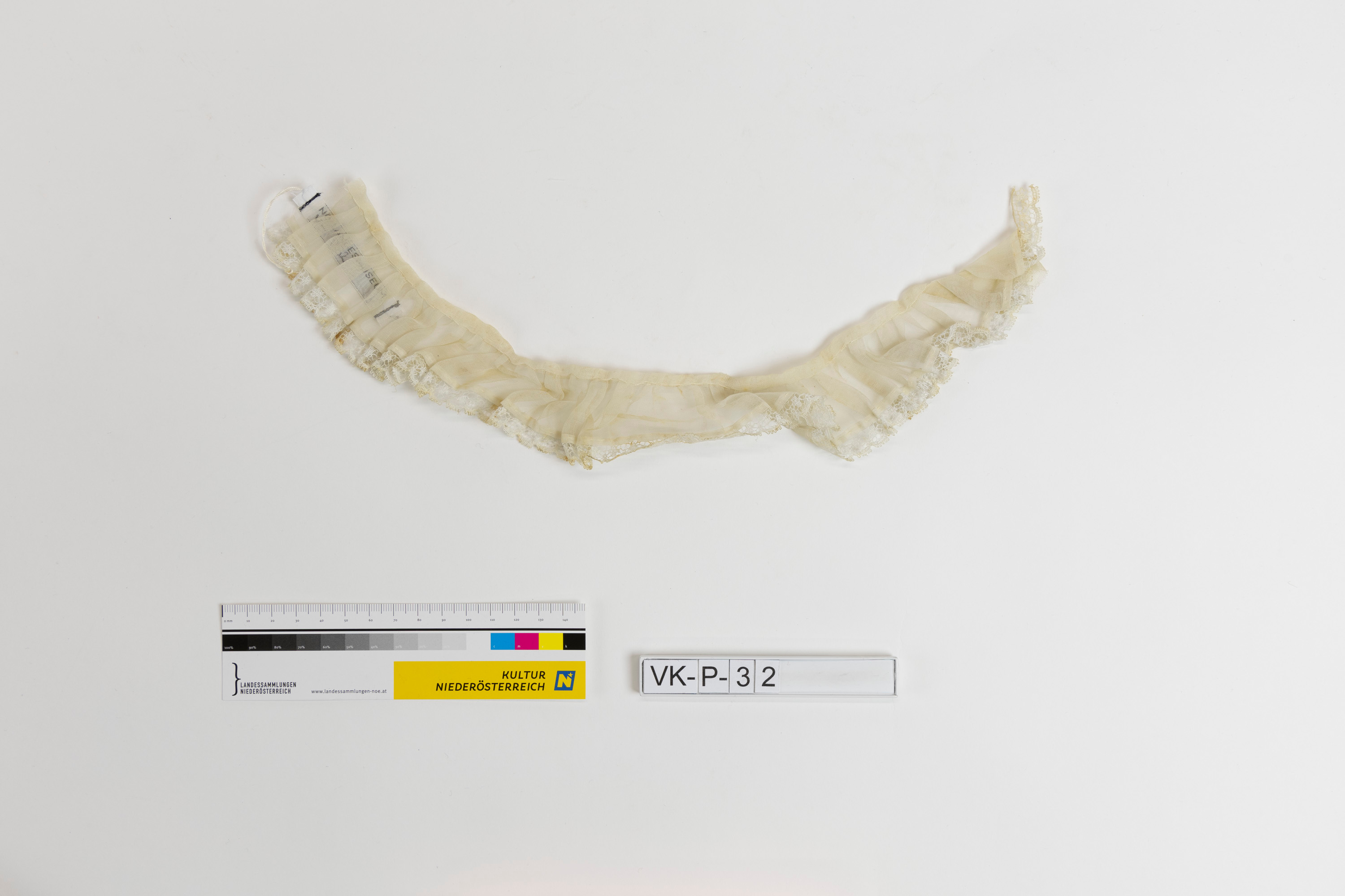 Weißer gefältelter Baumwollstreifen, besetzt mit einer Klöppelspitze im Bogenmuster.