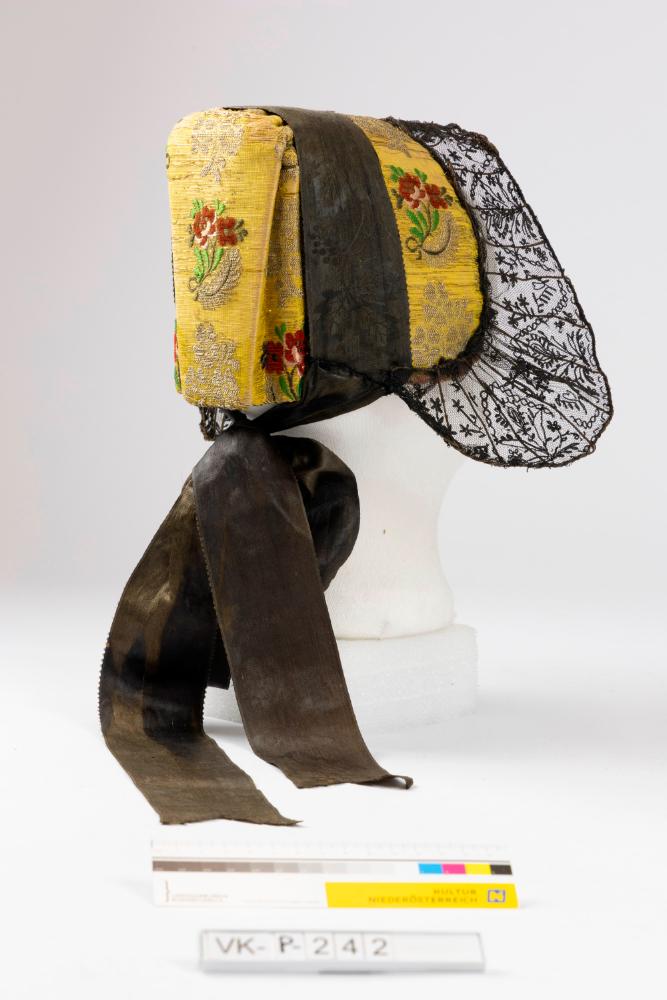 Drahtlhaube aus bunt floral gemustertem Goldbrokat, mit einem schwarzen Ripsband mit Schleife. Die Haube hat einen breiten mit Draht verstärkten Tüllspitzenschirm und ein Futter aus grünem Leinen.