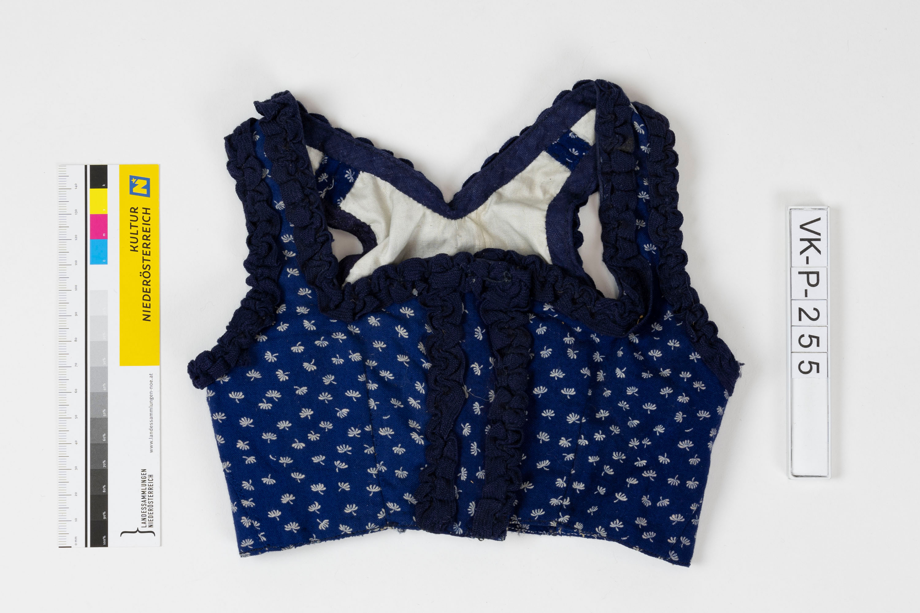 Ärmelloses Puppenleibchen aus blauem Baumwollstoff mit weißen Blümchen, an den Kanten verziert mit in Rüschen gezogenem dunkelblauem Stoff. Das Leibchen ist mit weißem Leinen gefüttert.