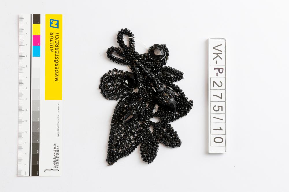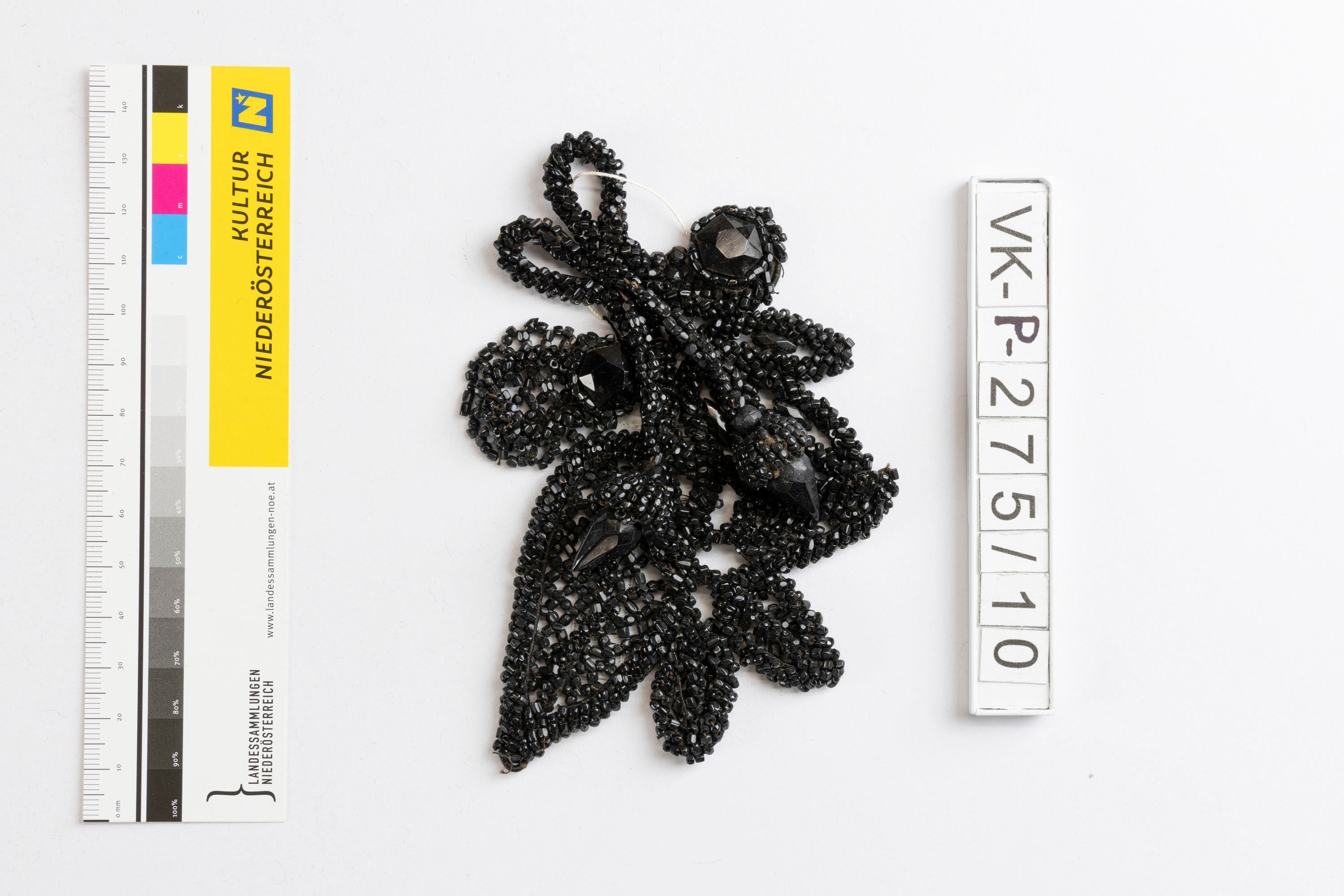 Schwarze Perlenstickerei in floraler Form mit einigen größeren mehrkantig geschliffenen Perlen.