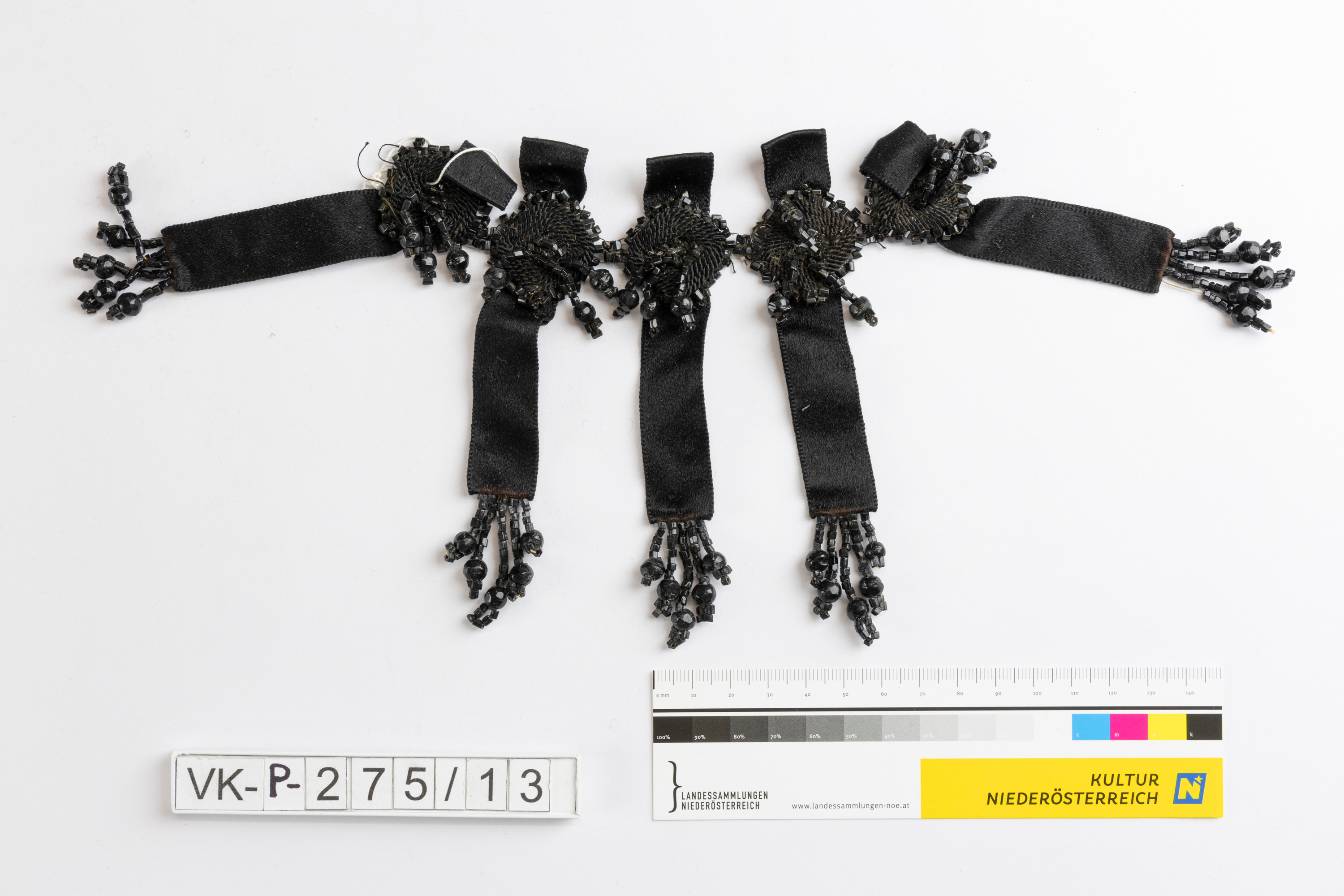 Schwarze Perlenstickereielemente, zusammen hängend. An jedem Element ist ein schwarzer Stoffstreifen vernäht, an dessen Ende schwarze Perlenquasten befestigt sind.