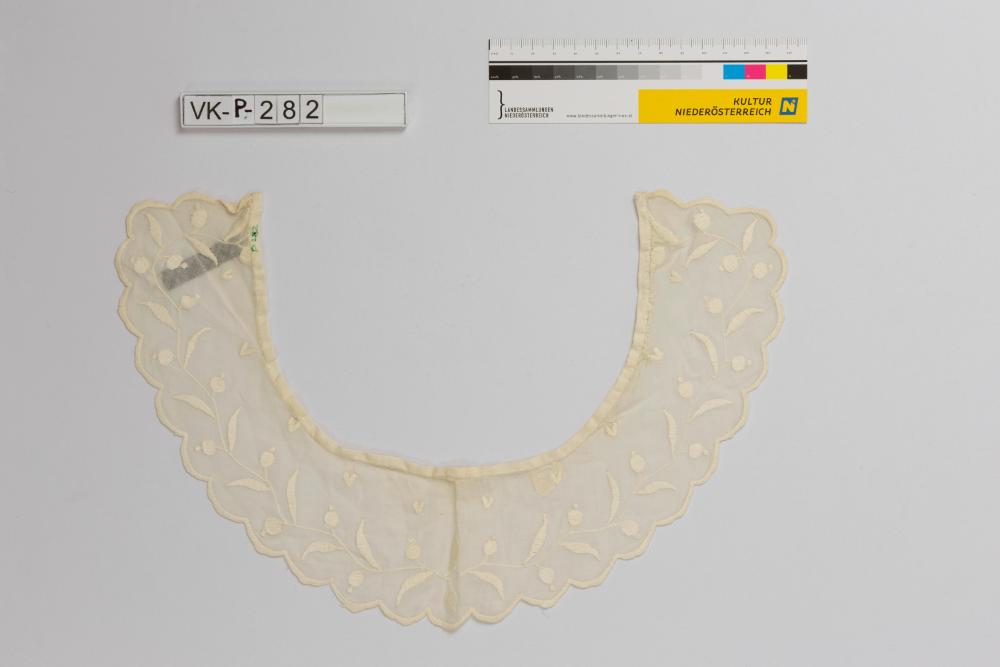 Runder weißer Baumwollkragen mit Bogenkante und floraler Weißstickerei, am Hals mit einem Band eingefasst.
