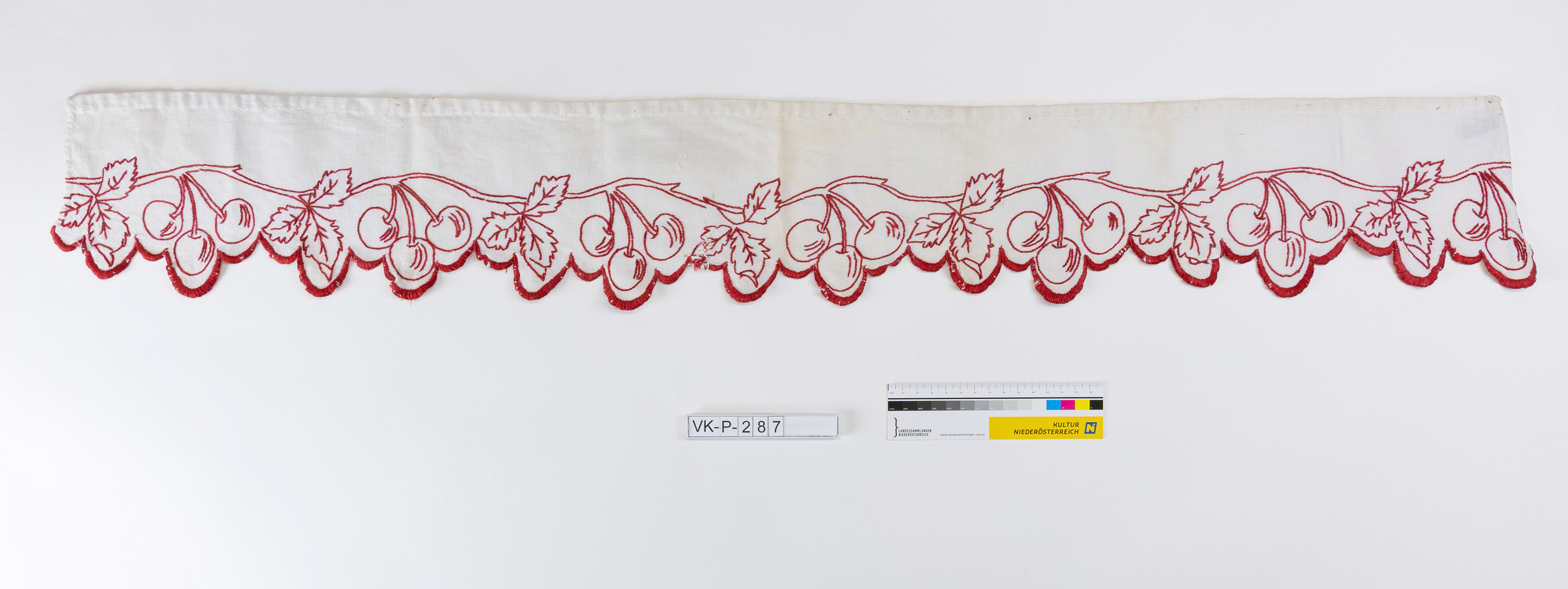 Weißes Kastenband aus Leinen, mit rot gefasster Bogenkante und rot gestickter Kirschzweigborte.