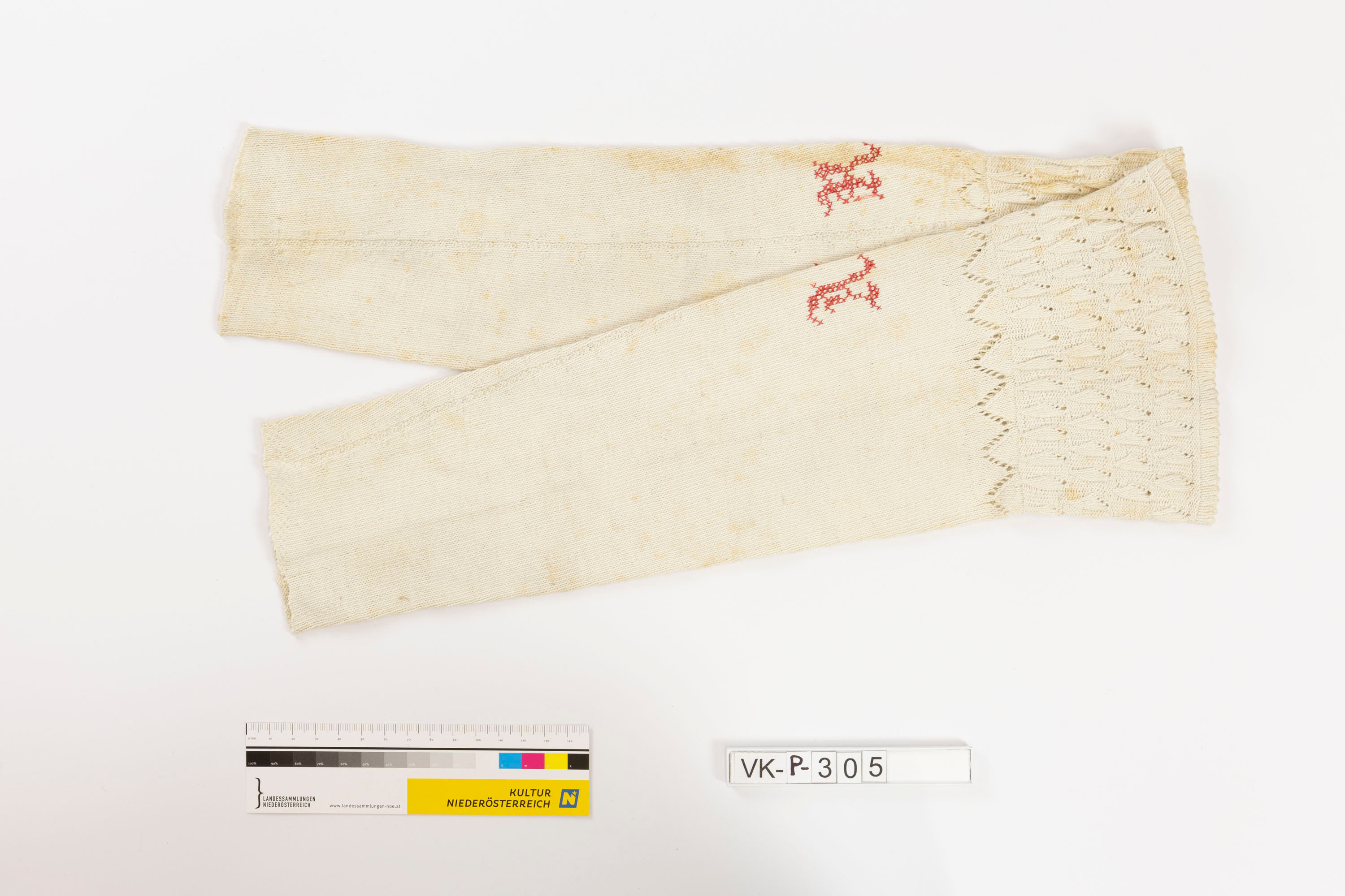 Ein Paar (zusammen genäht) weiße Damenstrümpfe aus Baumwolle mit Blättermuster im Randbereich und Mausezahnrand. Die Fußteile fehlen, die Strümpfe sind mit rotem Garn bestickt: "AR 4".