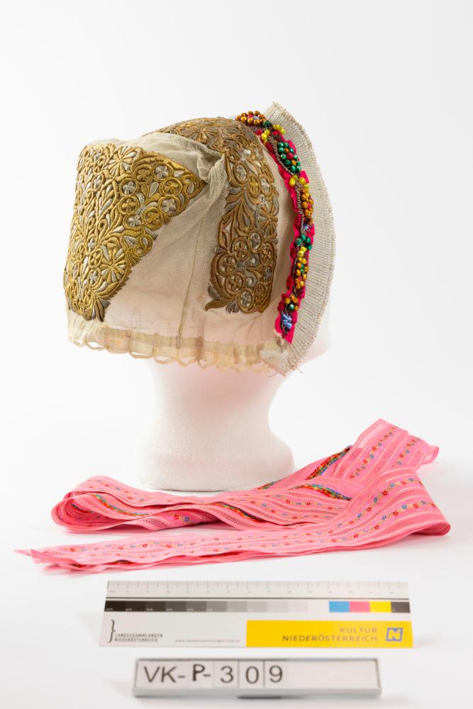Bodenhaube aus weißem Tüll, an Boden und Kopfteil mit dichter Goldstickerei (ornamental), mit einem aufgenähten rosa Satinband, das mit Glasperlen besetzt ist. Die Haube hat geblümte rosa Taftbänder, im Nacken einen Bogenrand mit Durchzug und einen dicht gezogenen Spitzenrand. Sie ist teilweise auf schwarzem Seidenpapier aufgenäht.