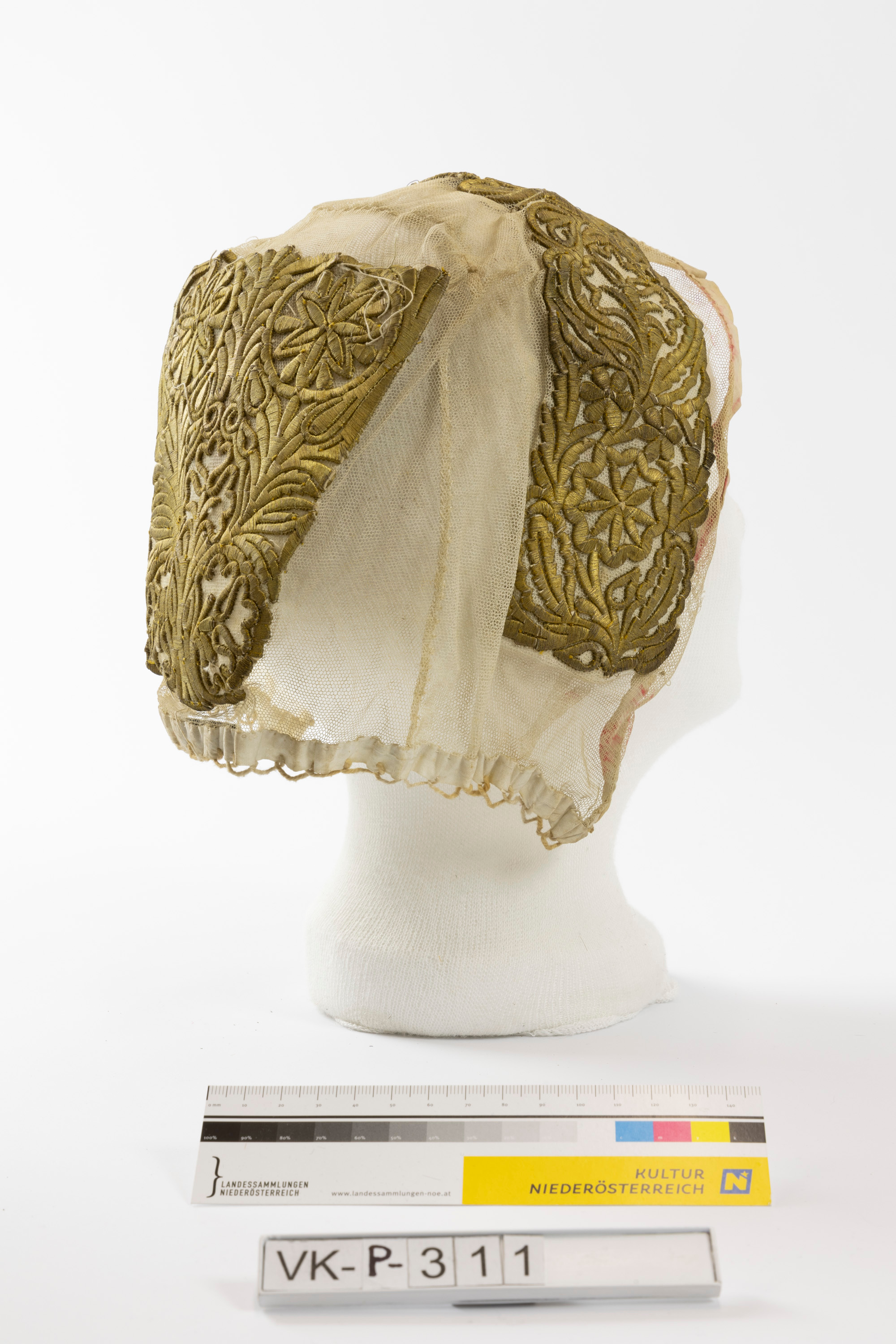 Bodenhaube aus weißem Tüll, am Boden mit Goldstickerei verziert (ornamental), am Kopf eine dichte gestickte Bordüre (floral). Die Haube ist mit Baumwolle eingefasst und hat im Nacken einen Bogenrand für einen Durchzug, sie ist teilweise auf scharzes Seidenpapier genäht.