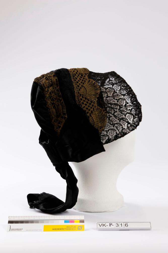 Spitzenbesetzte schwarze Haube mit Schleife, Drahtgerüst und großflächiger Verzierung mit Golddraht.