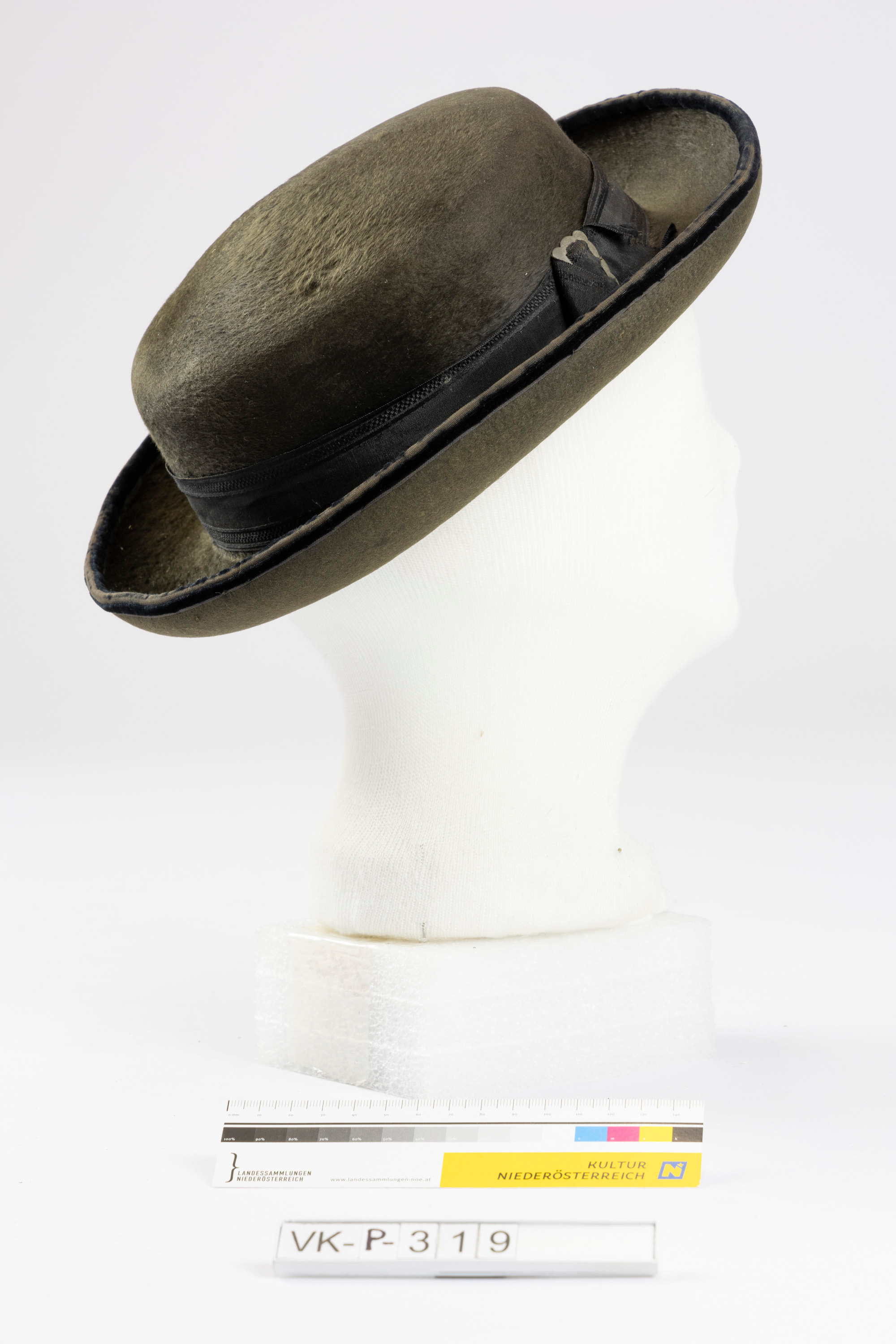 Olivgrüner Filzhut ("Reindlhut"), rund mit aufgebogener Krempe und einem Hutband aus Rips mit Streifenmuster.