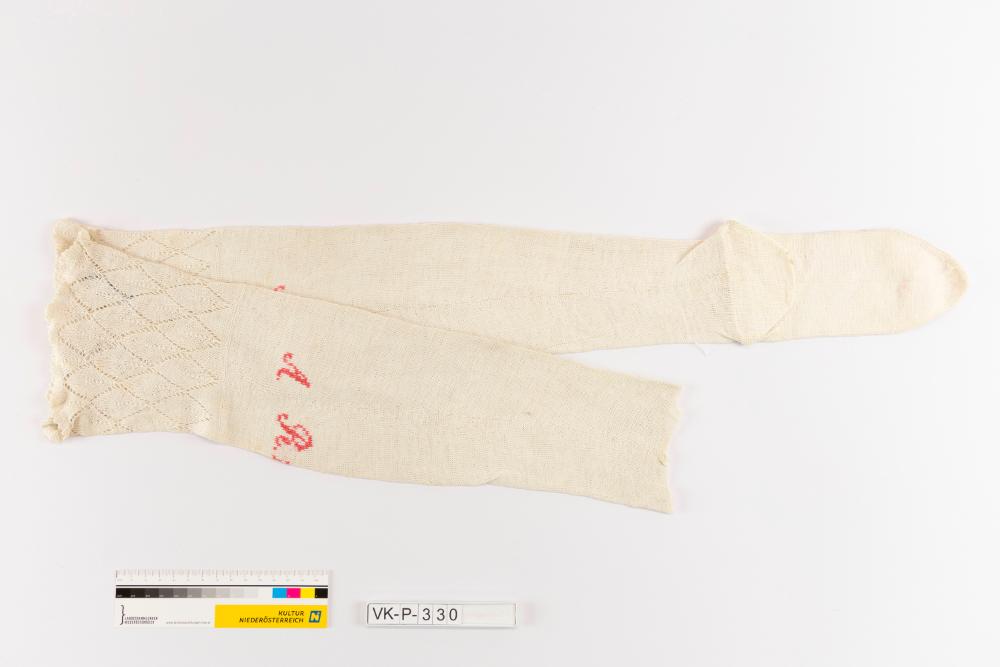 Ein Paar (zusammen genäht) glatt gestrickte Damenstrümpfe aus weißem Zwirn mit Rautenlückerlmuster und Mausezahnrand im oberen Bereich und roter Bestickung: "A R 15".