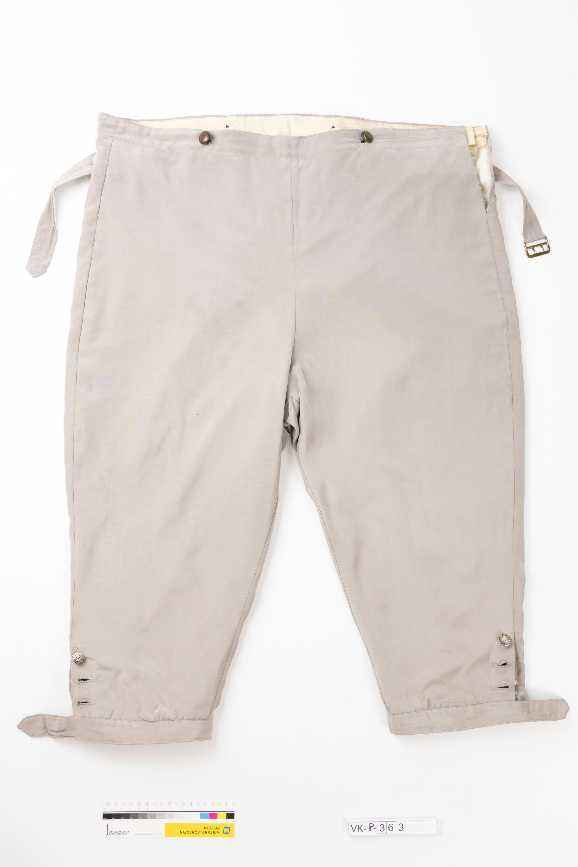 Knielange Herrenbundhose aus grauem glänzendem Stoff mit geknöpften und geschnallten Beinabschlüssen und vier Knöpfen für Hosenträger. Die Knöpfe sind mit durchbrochenen Ornamenten halbkugelförmig verziert.