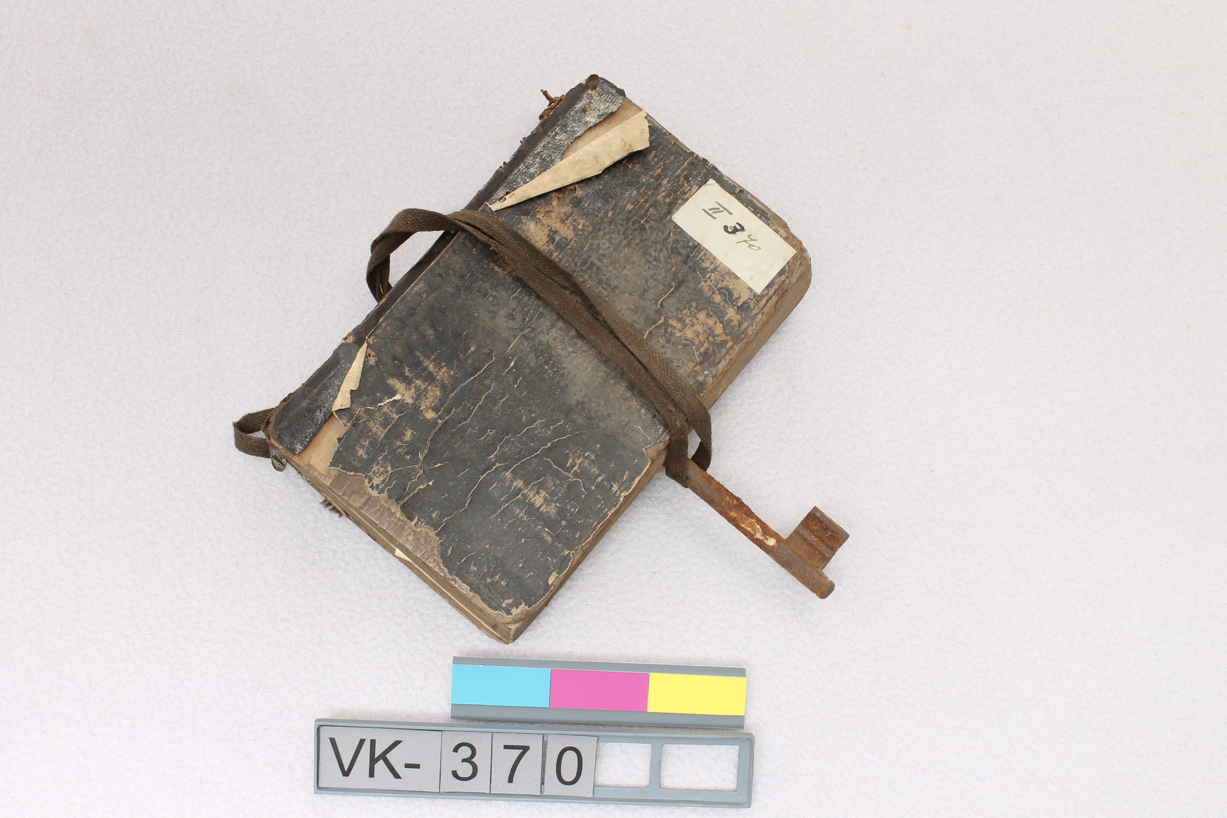 In dunklem Papier gebundenes Buch mit einem eingelegten Eisenschlüssel, die Seiten wurden zu diesem Zweck ausgehöhlt. Der Schlüsselbart steht heraus, das Buch hat zusätzlich ein braunes Stoffbändchen. Laut Inventarbuch "Himmelsschlüssel".
