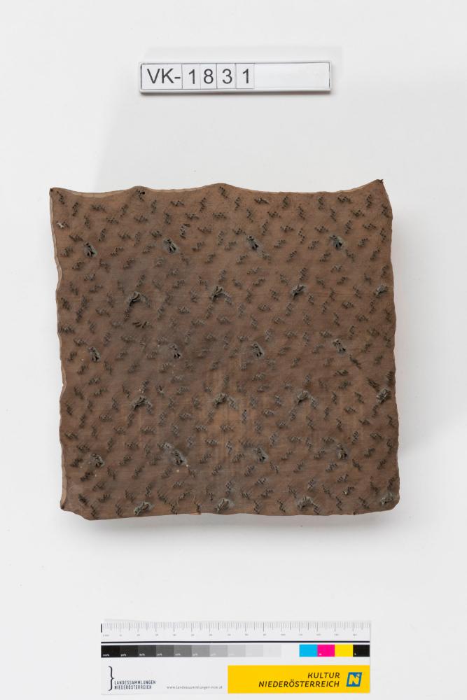 Färbermodel aus Holz mit Metallstiften und Metallelementen auf einer Trägerplatte mit zwei Kerben. Druckmuster: Pünktchenzacken, kleine Tulpen. Das Model stammt aus der Kattunfabrik Altkettenhof bei Schwechat.