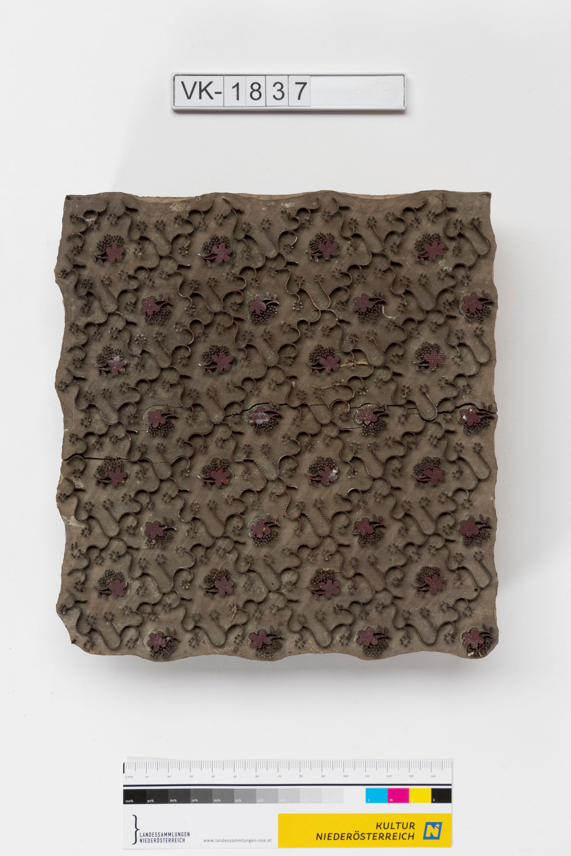 Färbermodel aus Holz mit Metallstiften und Metallelementen auf einer Trägerplatte mit zwei Kerben. Druckmuster: Blüten, dazwischen geschweifte Zierlinien, mit Resten roter Farbe. Das Model stammt aus der Kattunfabrik Altkettenhof bei Schwechat.