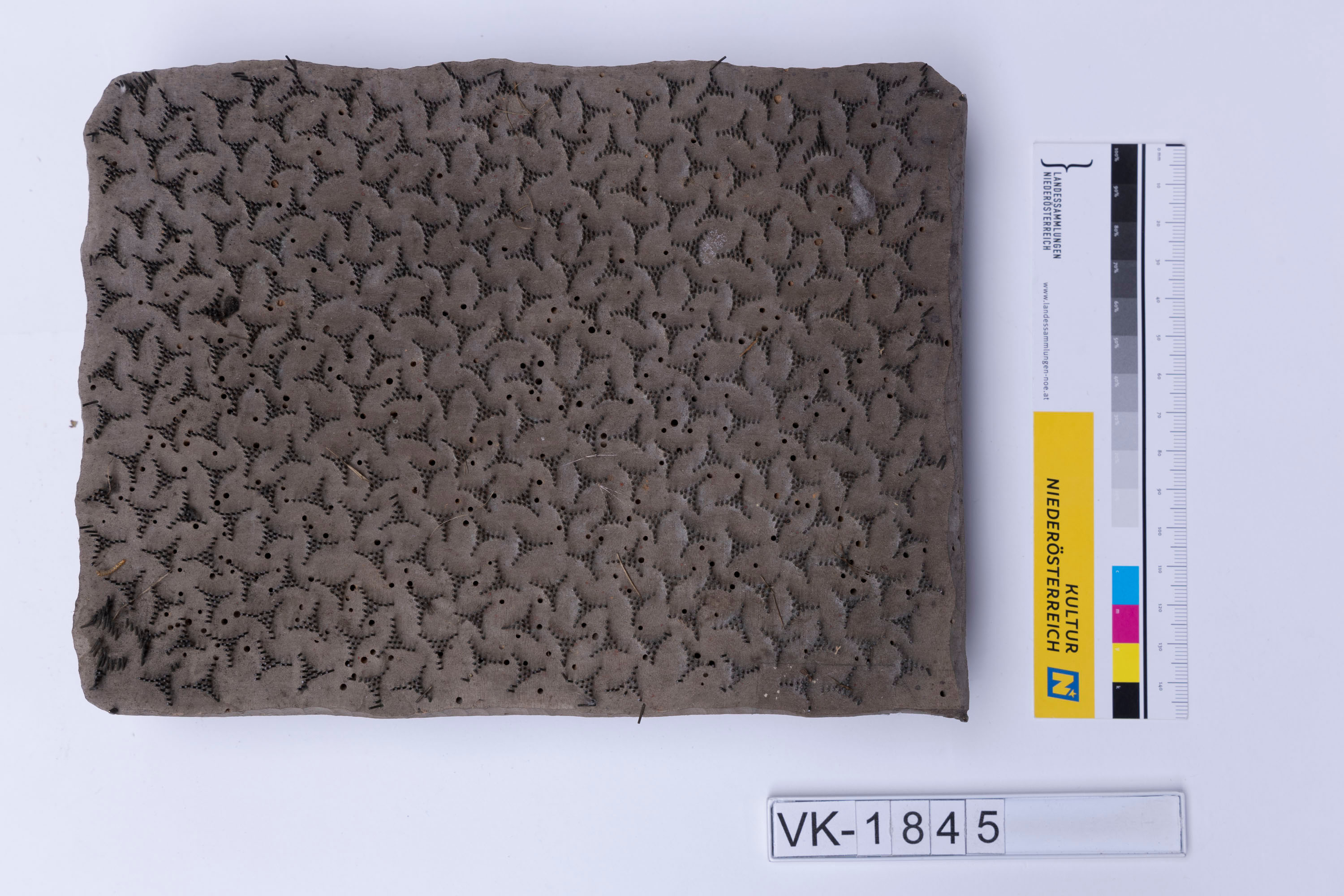 Färbermodel aus Holz mit Metallstiften auf einer Trägerplatte mit zwei Kerben. Druckmuster: Zu Dreiecken gruppierte Pünktchenelemente. Das Model stammt aus der Kattunfabrik Altkettenhof bei Schwechat.