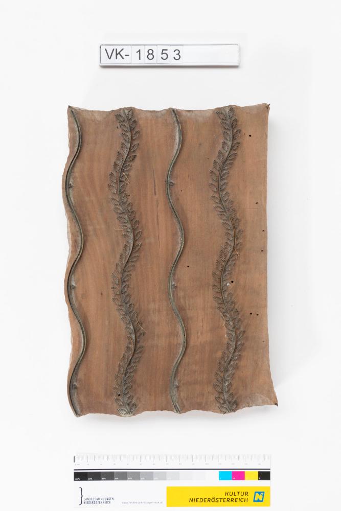Färbermodel aus Holz mit Metallstiften und Metallelementen und zwei Kerben auf der Rückseite. Druckmuster: Wellenlinien, abwechselnd alleine und mit Blättchenmuster, (Muster Nr. 190 des Druckers). Das Model stammt aus der Kattunfabrik Altkettenhof bei Schwechat.