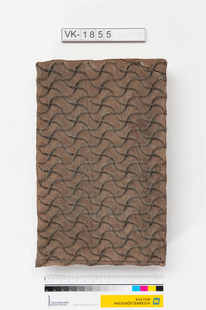 Färbermodel aus Holz mit Metallstiften auf einer Trägerplatte mit zwei Kerben. Druckmuster: Gekreuzte gepunktete Wellenlinien, das Model hat an beiden Schmalseiten angesetzte Verlängerungen, (Muster Nr. 272 des Druckers). Das Model stammt aus der Kattunfabrik Altkettenhof bei Schwechat.