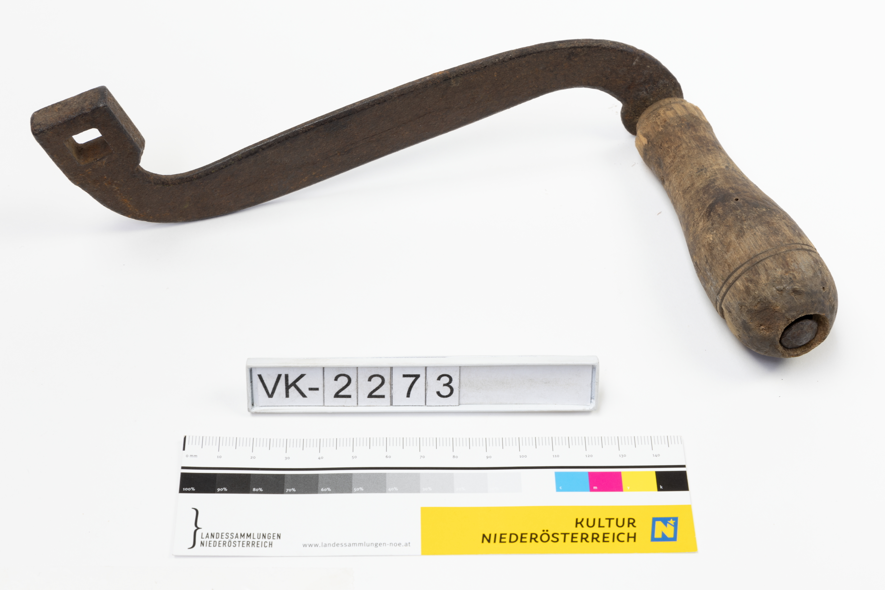 Handkurbel ("Werfel") mit Holzgriff, leicht geschwungener Form und Vierkantaufnahme.
