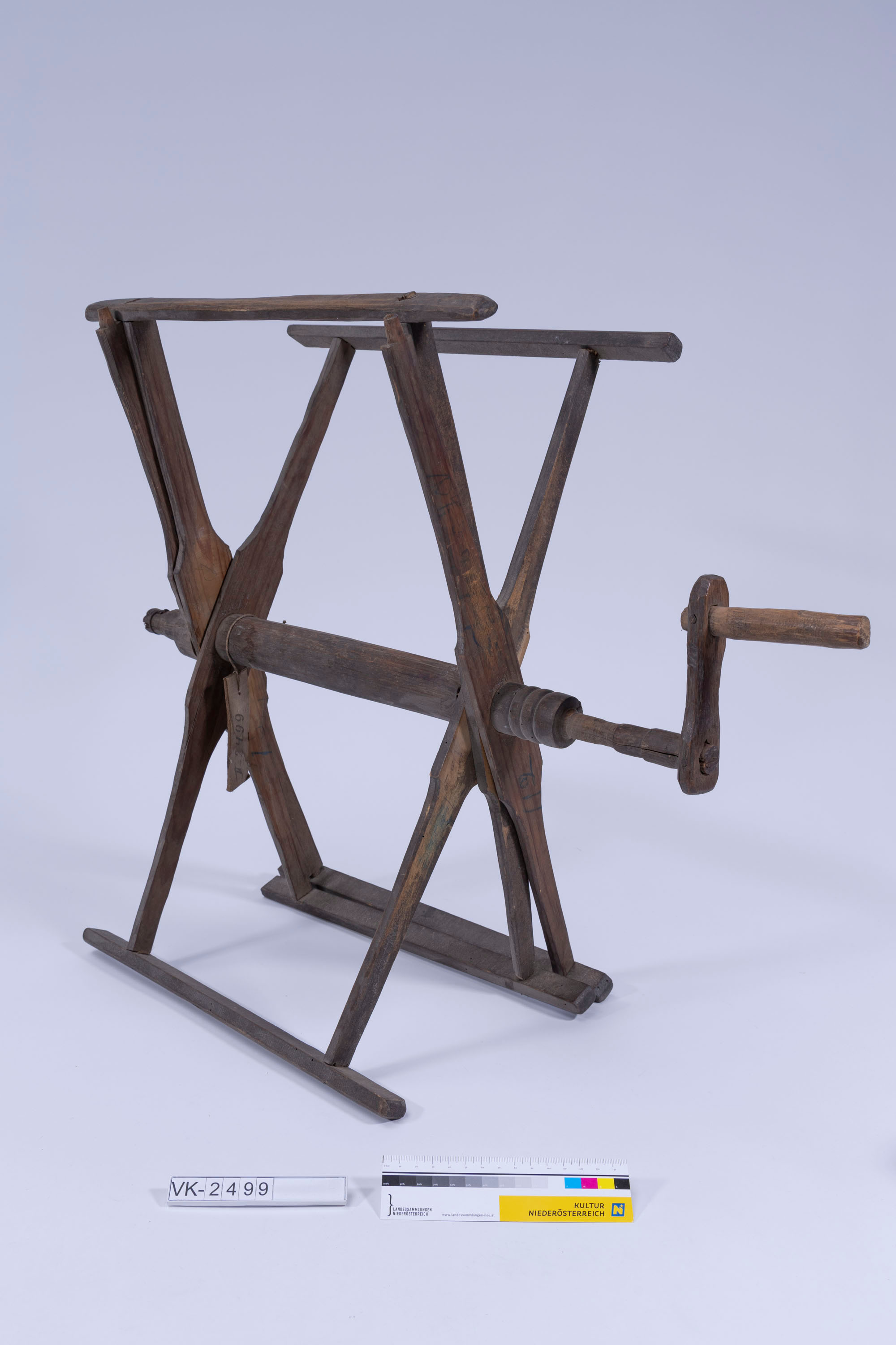 Sechsflügelige Haspel mit einer Holzkurbel.